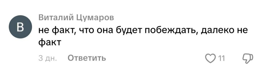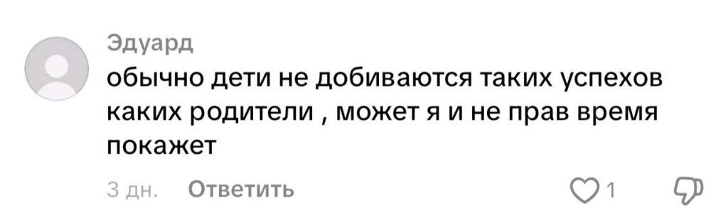 «Не факт, что она будет побеждать. Далеко не факт», — откомментировал третий. А может быть никто и не ждет громких побед. Просто наблюдают за продолжением династии Дарьи и Уле. «У нее просто нет другого выбора», — с улыбкой написала еще одна пользовательница мессенджера. Мне кажется, что у современных малышей выбор есть всегда. И если они чего-то не хотят, то их в этом сложно убедить и тем более заставить.