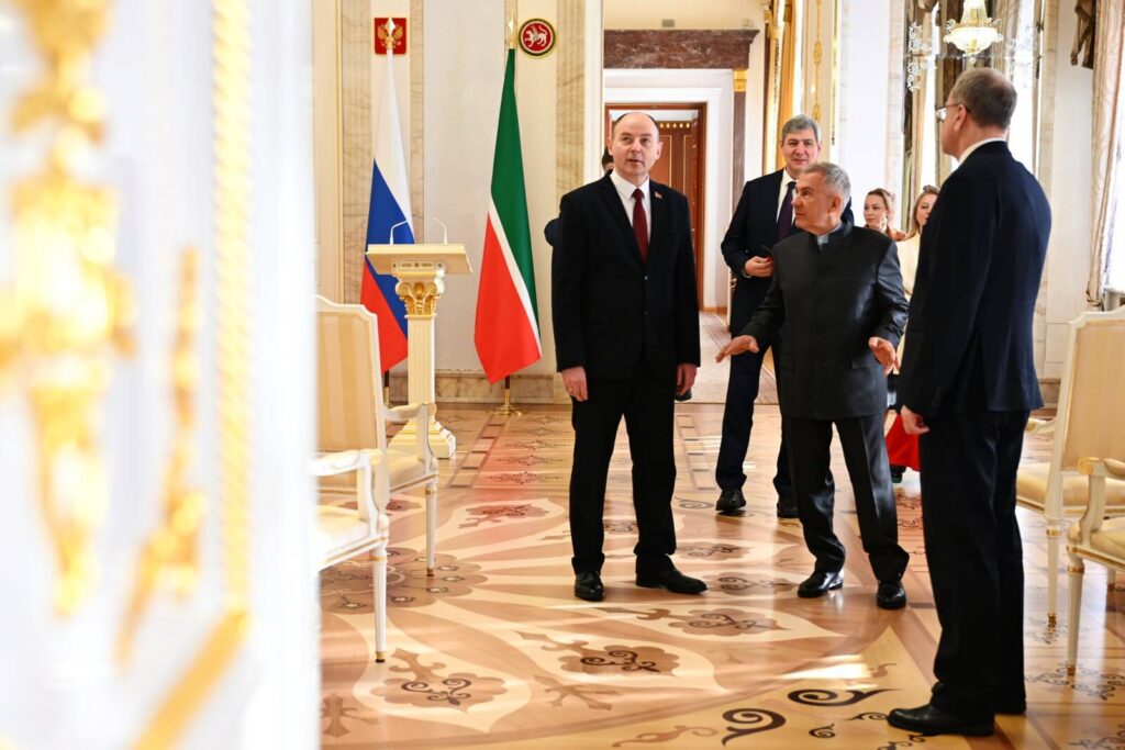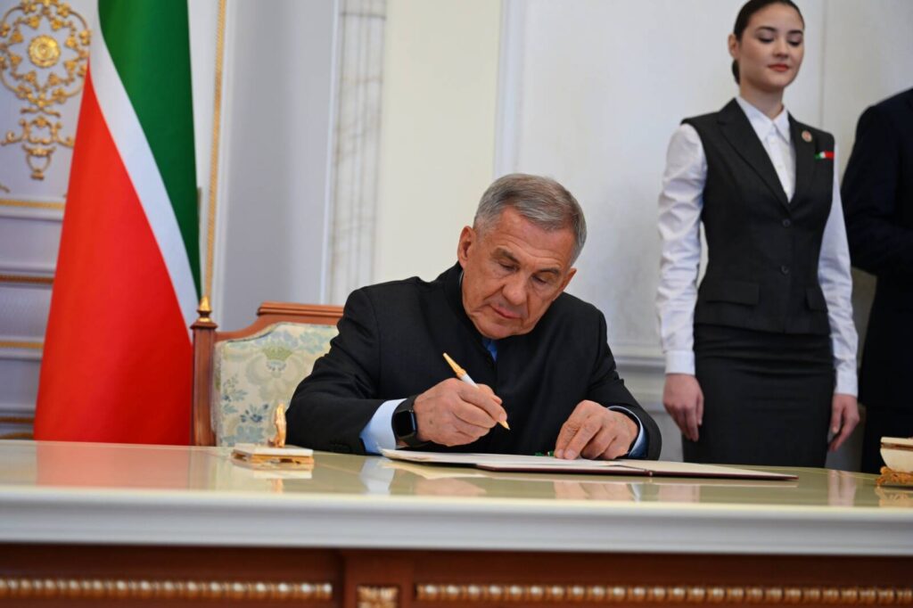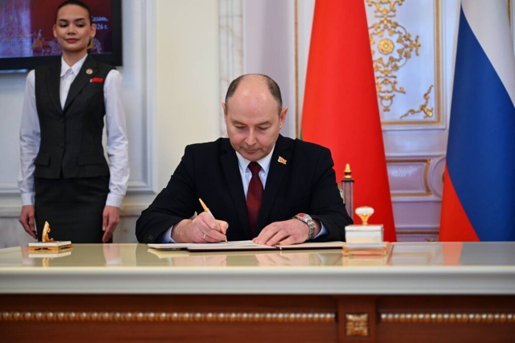 Свои подписи под документом поставили председатель Миноблисполкома Алексей Кушнаренко и Раис Республики Татарстан Рустам Минниханов во время приема в казанском Кремле.
