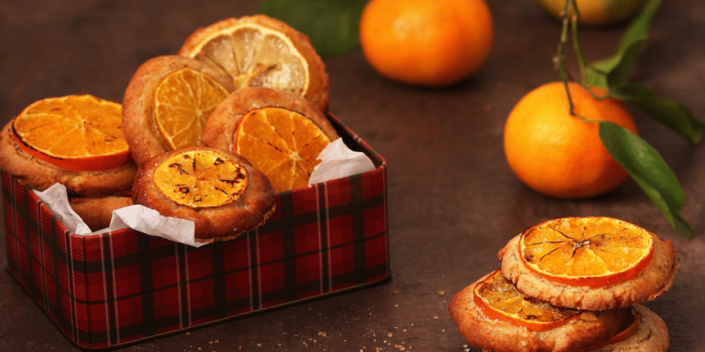 - Слегка взбейте желток и смажьте им края печенья. В каждое углубление выложите по кружочку мандарина. Сверху на мандарин снова посыпьте немного сахара.