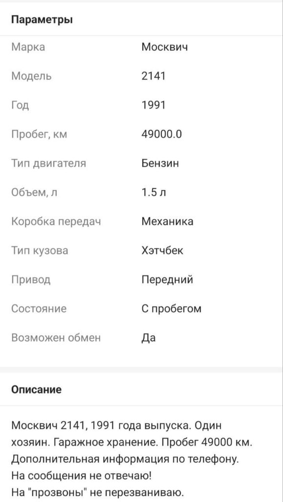 Авто продавца 1991 года выпуска имеет пробег в 49000.0 км. На нем, кроме могилевчанина, никто никогда не ездил. Все время «Москвич» хранился в гараже. Остальную информацию владелец попросил узнавать строго по телефону в строго обозначенное время. На сообщения мужчина не отвечает, а на прозвоны не реагирует.