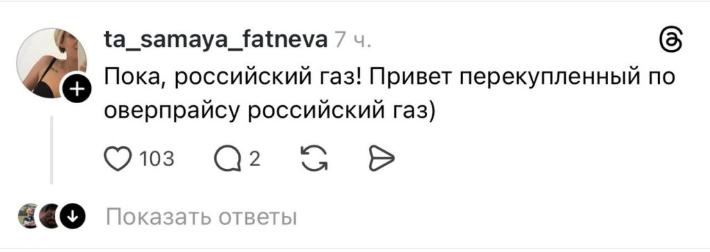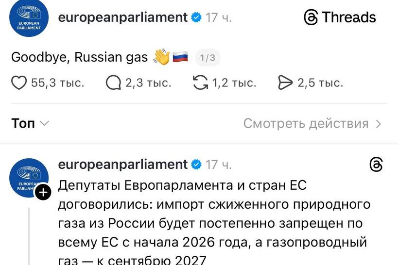 Европейский парламент одобрил поэтапное прекращение импорта российского газа и сжиженного природного газа в страны Евросоюза. Новость была опубликована в официальном аккаунте Европарламента в соцсети Threads. Однако реакция пользователей оказалась не поддержкой, а волной иронии и критики.