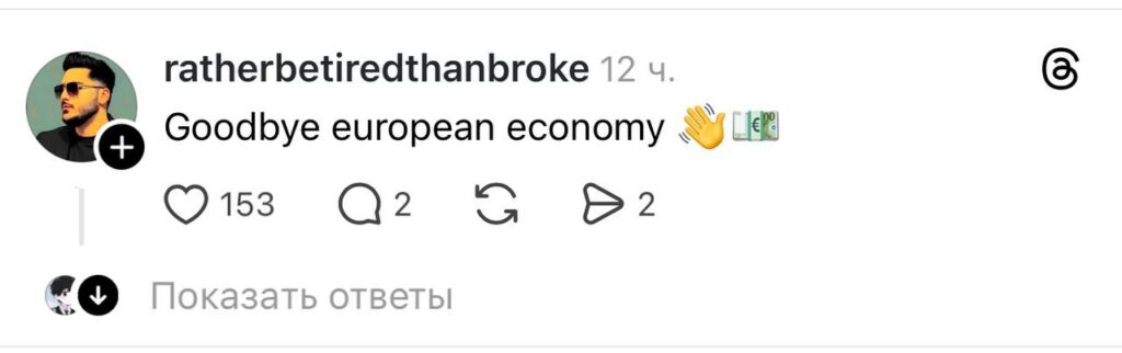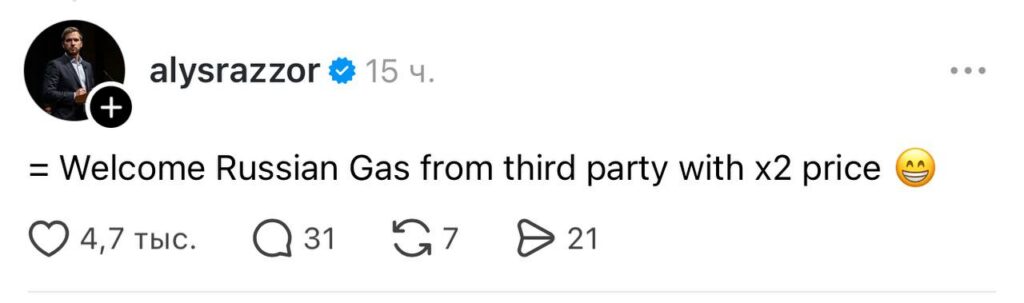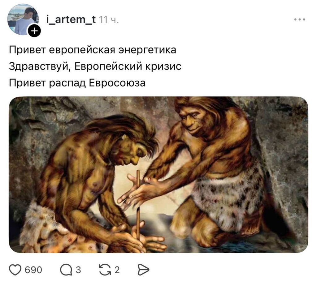 Многие пользователи отреагировали на новость с ответной иронией: «прощай европейская экономика». Припомнили и стрим жителя Ростова в 2022 году в ответ на санкции ЕС, который круглосуточно транслировал зажженные газовые конфорки. «Я могу забыть выключить газ, а вы?» — шутливо отмечает комментатор из России.