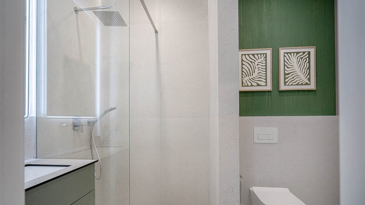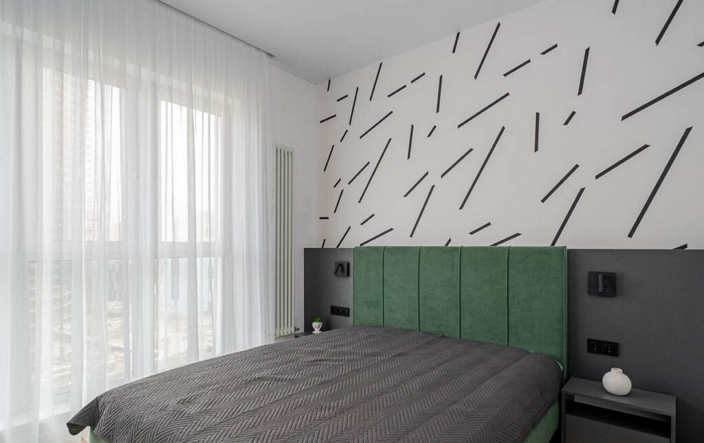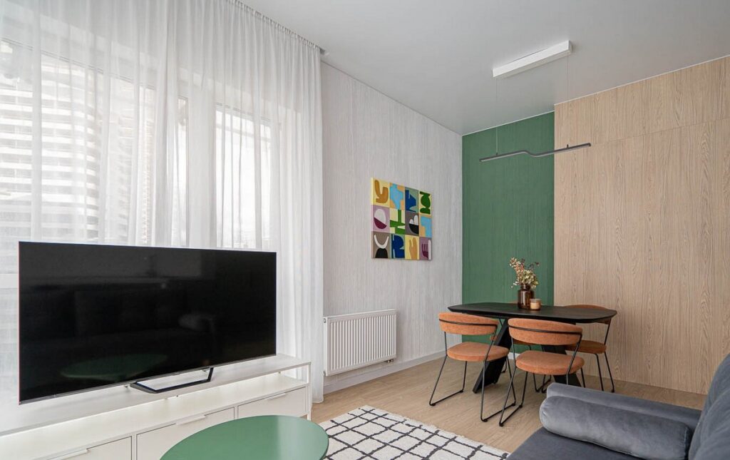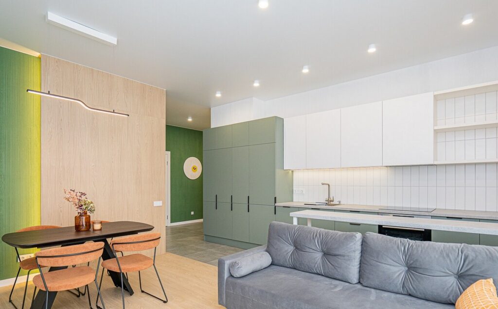 Жилое пространство квартиры включает в себя две изолированные комнаты и общее пространство, которое объединяет три функциональные зоны. Все комнаты и общие зоны выдержаны в едином стилистическом решении. Светлые отделочные материалы, используемые в интерьере, прекрасно гармонируют с легкими зелеными оттенками.