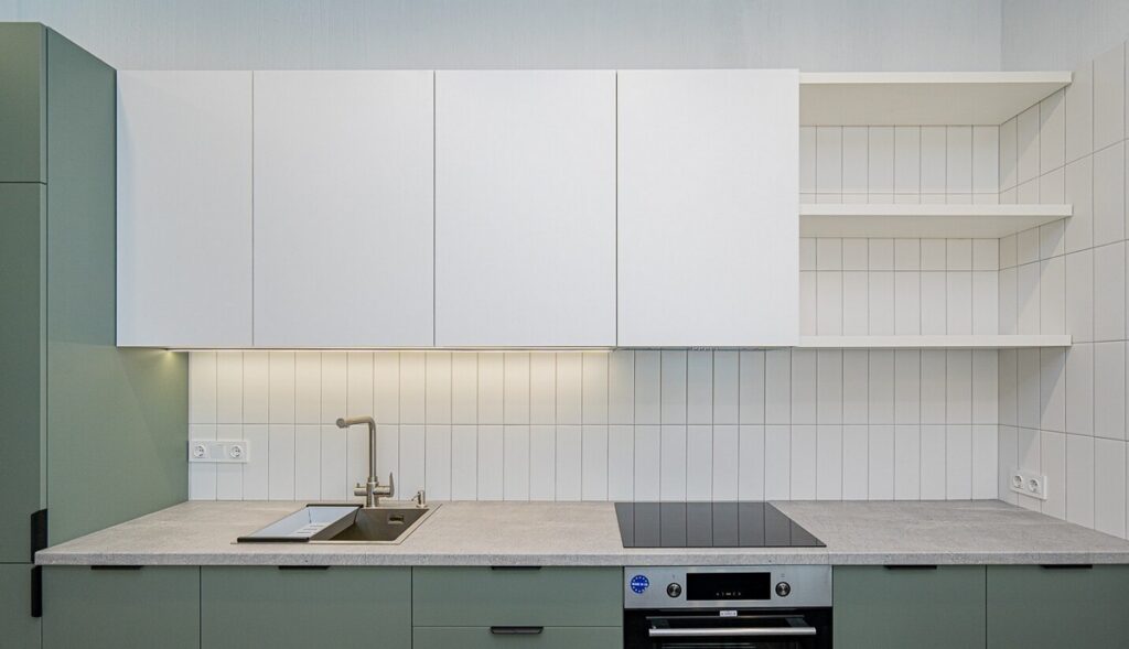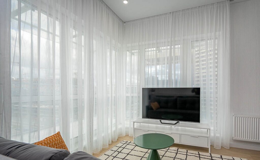 Одной из особенностей квартиры является наличие нескольких окон в пол, которые формируют застекленный угол, наполняя пространство естественным светом. Кухня оборудована всей необходимой бытовой техникой. Рабочая зона представлена барной стойкой, а обеденный стол удобно размещен сбоку.