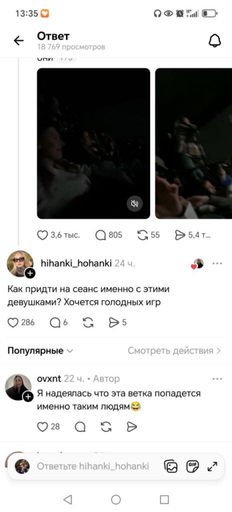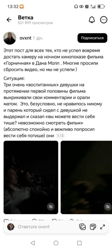 В Threads активно обсуждаются ролики, снятые из зала mooon как раз во время показа американского триллера. В первом видео голоса актеров громко перебивают зрители, причем женского пола — лексика крайне ненормативная, грубая.
