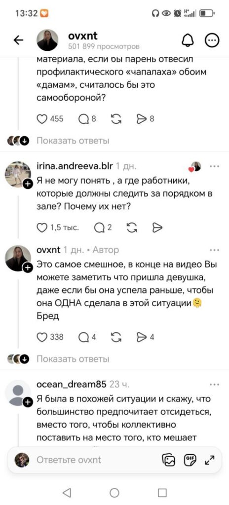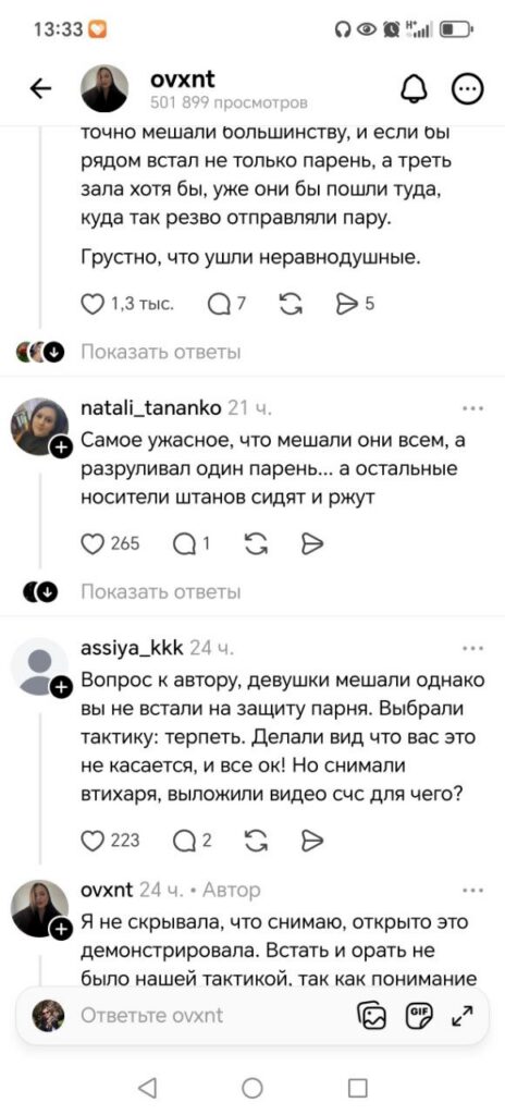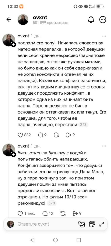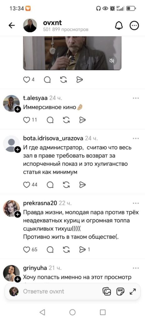 Автор роликов прояснил ситуацию, рассказал предысторию: три «воспитанные» девушки на протяжении первой половины фильма громко комментировали происходящее на экране, орали матом.