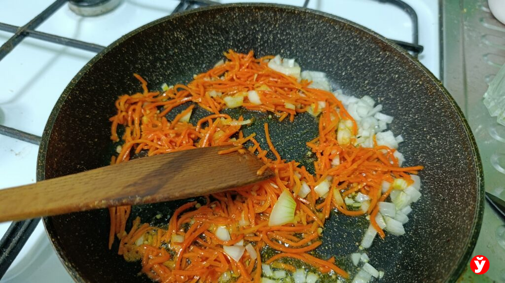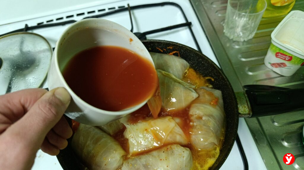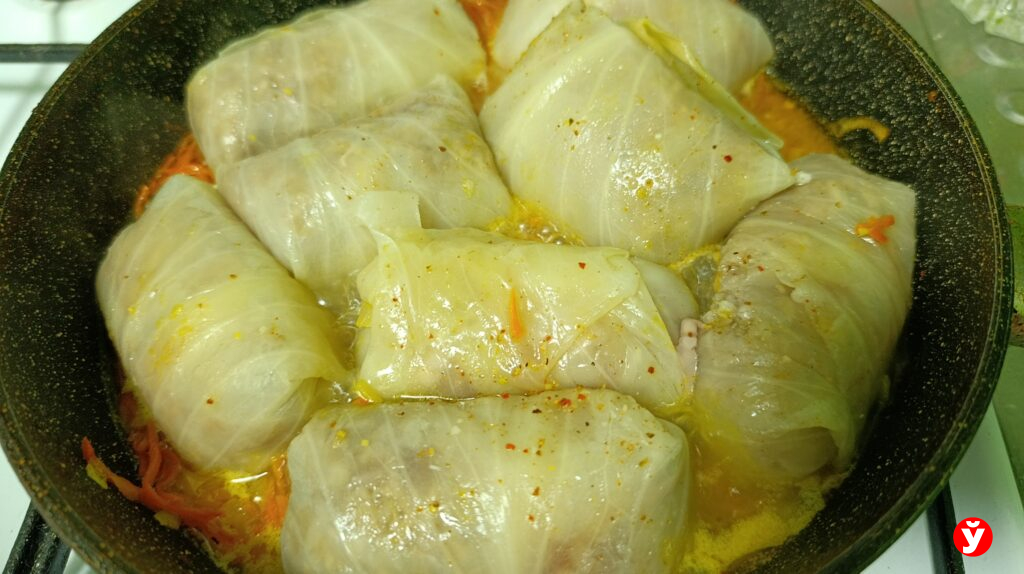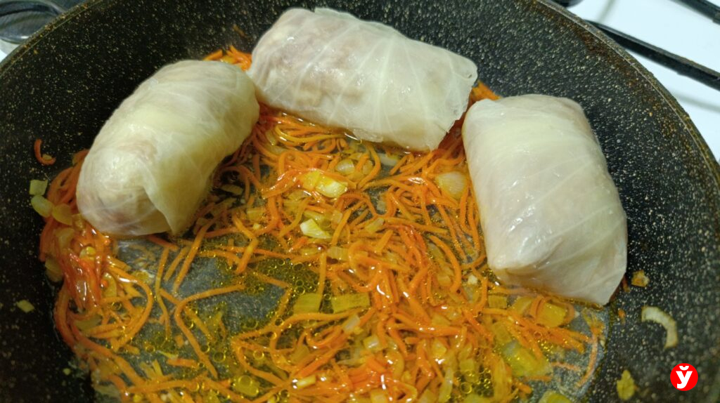 После того, как голубцы разморозились сами, без помощи микроволновки, я мелко нарезал и пассеровал лук и морковь. В овощи потом поместил полуфабрикаты, залив их небольшим количеством воды и посолив. После того, как они минут 15-20 потомились на медленном огне, добавил еще воду с томатной пастой и специями. Последнее по традиции добавляем по вкусу.