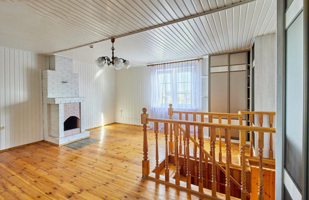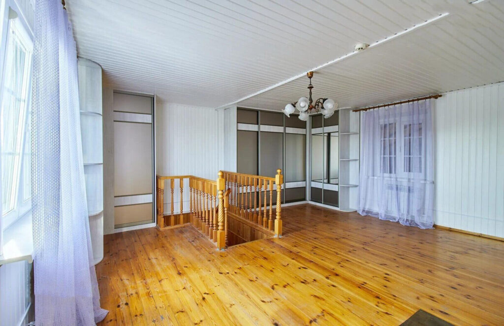 На втором этаже, к которому ведет красивое деревянное лестничное покрытие, располагается еще одна большая комната. Это пространство можно использовать по своему усмотрению: например, организовать там игровую для детей, кабинет для работы или же дополнительную спальню для гостей.
