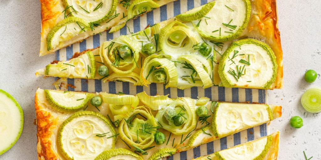Завершить нашу зеленую трапезу можно ароматным, домашним пирогом. Он не требует замеса теста и возни с дрожжами. Простой, понятный и очень красивый пирог из слоеного теста с кабачками, луком-пореем и горошком станет украшением стола. Хрустящие бортики и сочная, нежная начинка — это идеальный вариант сытного завтрака или ужина для всей семьи.