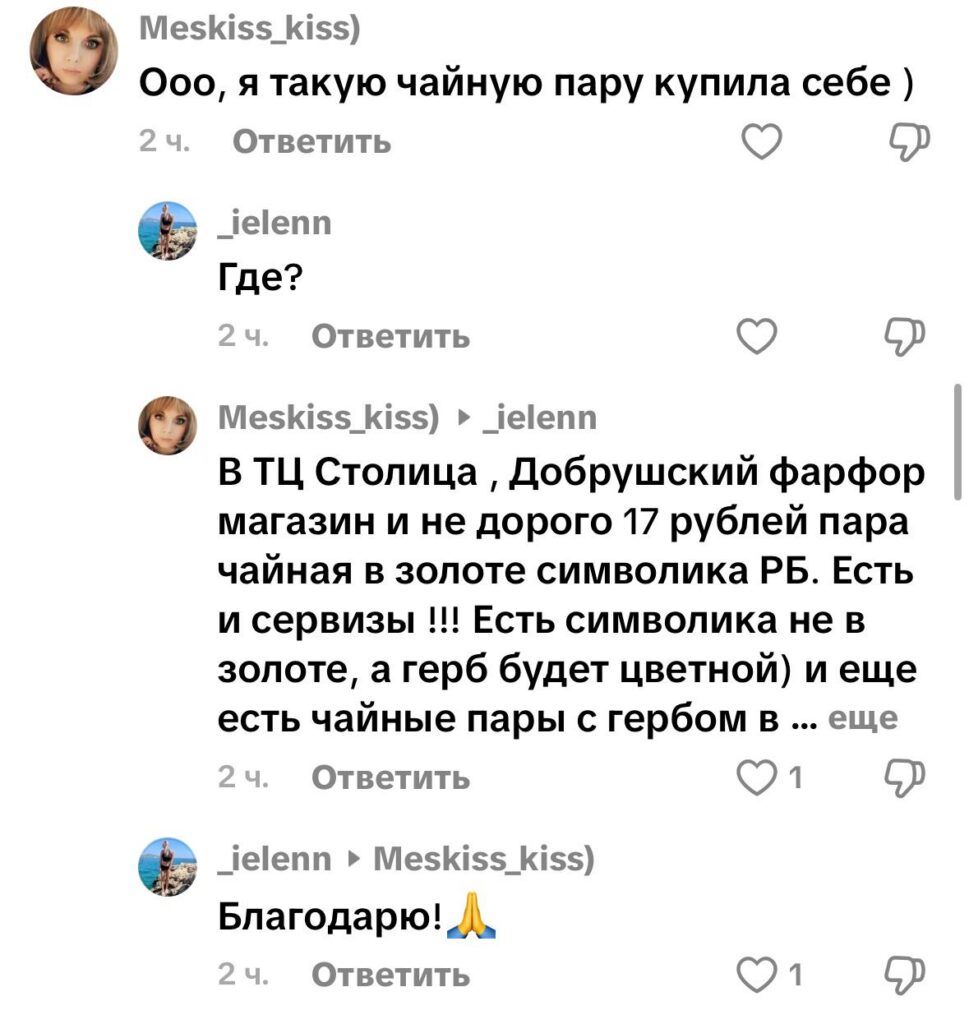 И правда, уже другой пользователь подсказывает интересующимся, что это Добрушский фарфор, который можно раздобыть в ТЦ «Столица» всего за 17 бел. руб. Кроме того, оказывается, помимо такого сервиза, как на видео, есть еще другой — разноцветный, с Государственным флагом Республики Беларусь.