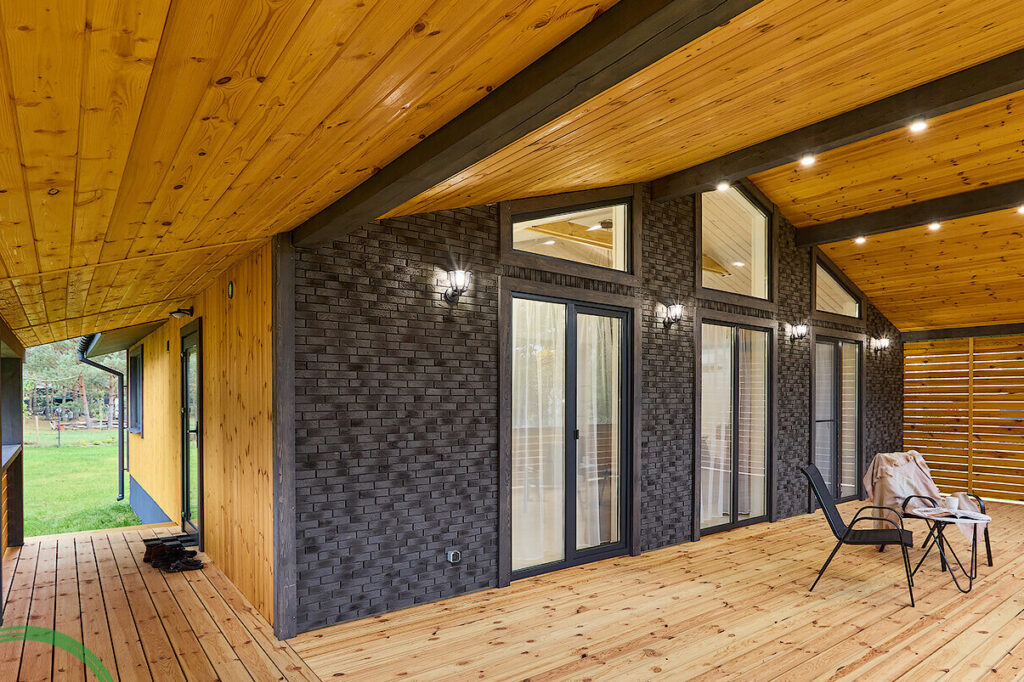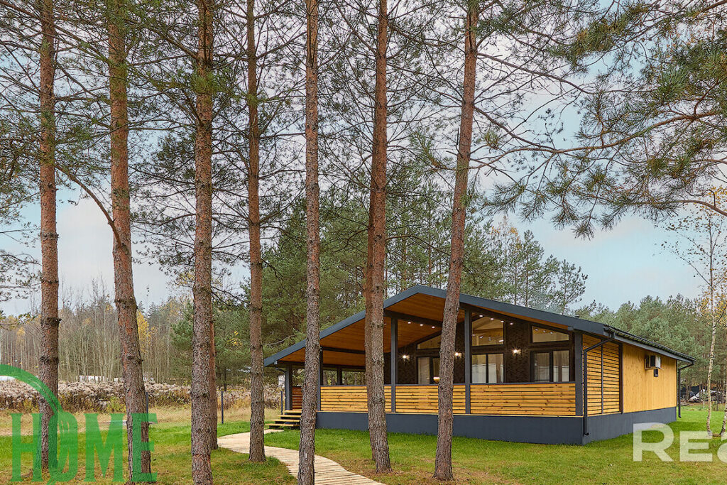 Этот каркасный дом, расположенный в садоводческом товариществе «Приозерный» в Логойском районе, построен из бруса размером 150 мм на 50 мм и стоит на винтовых сваях. Крыша дома покрыта металлической кровлей. Площадь дома составляет 125 квадратных метров.