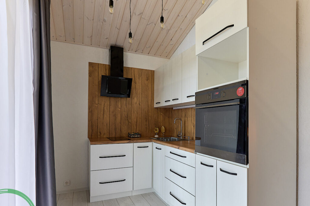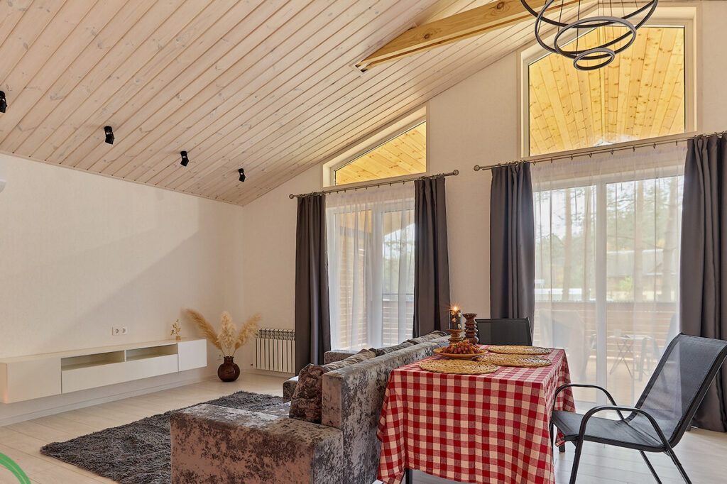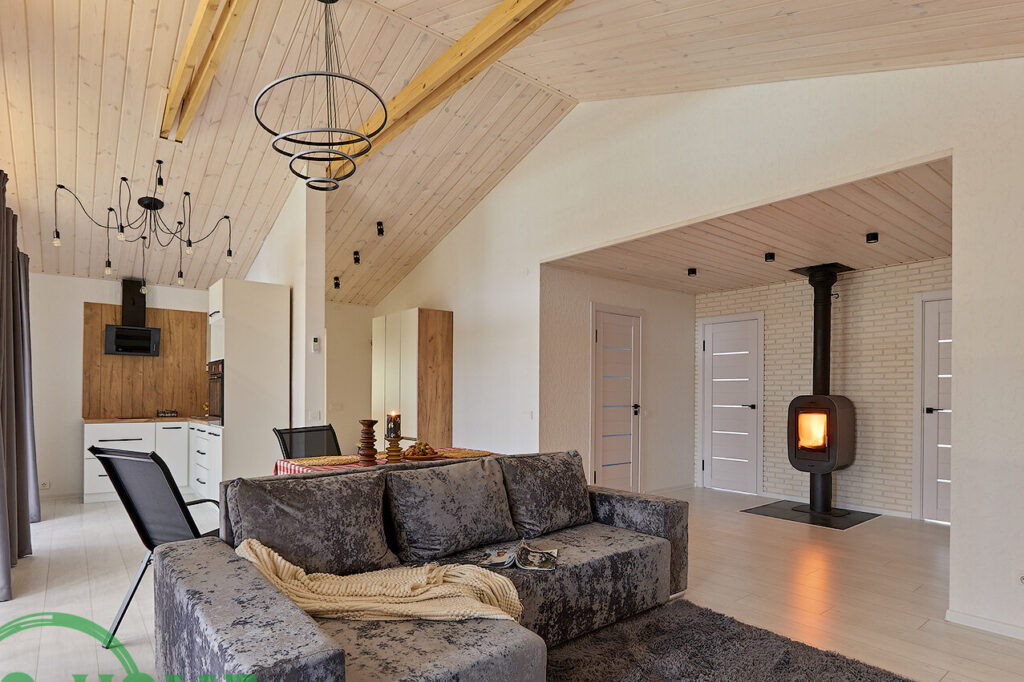 Внутреннее оформление дома выполнено с хорошим вкусом и качеством. Светлый интерьер, панорамные окна и высокие потолки создают ощущение простора и наполняют пространство естественным светом. Кухня и гостиная объединены в одно большое помещение. Все зоны дома оборудованы современной мебелью и бытовой техникой. Из кухни-гостиной есть выход на террасу.