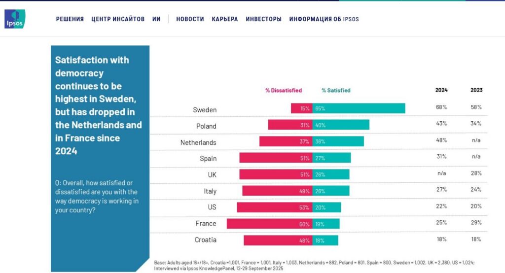 Интересно, что на втором месте по недовольству демократией — США. Там недовольных 53%, и, судя по постановке вопроса, это те же самые люди, которые обвиняют Трампа в фашизме и ходят маршами No Kings. Поэтому создается впечатление, что все исследование делалось ради одной этой цифры, чтобы, опять же, ударить по Дональду.