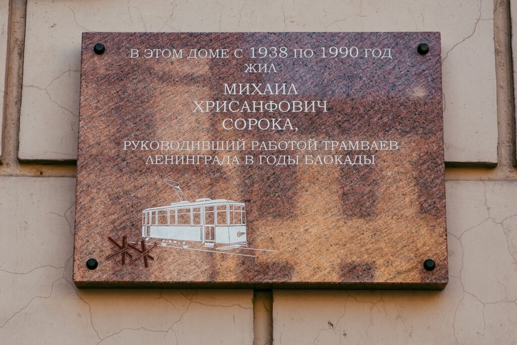 Как напоминание современникам о трагических, но вместе с тем и героических днях обороны Ленинграда в Великую Отечественную войну, в городе стоит памятник «Блокадному трамваю», инициатором установки которого был начальник Трамвайно-троллейбусного управления Ленинградского горисполкома в годы войны, автор книги «Фронтовой трамвай» Михаил Хрисанфович Сорока. В уходящем году, году 120-летия со дня рождения Михаила Сороки, память о нем увековечили открытием мемориальной доски «Командиру блокадного трамвая». Ее установили на доме по 8-й Советской улице, где Михаил Сорока жил с 1938 по 1990 годы и откуда уходил руководить трамвайным движением в блокадном Ленинграде.