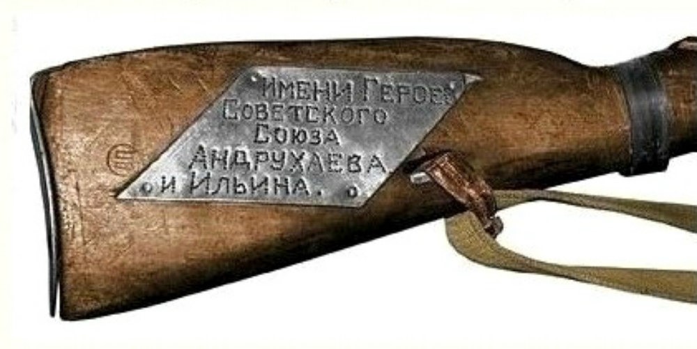 Инициатор снайперского движения 136-й стрелковой дивизии Южного фронта политрук Хусен Андрухаев героически погиб в тяжелых боях за Ростов. В память о нем учреждается снайперская винтовка его имени. В дни легендарной обороны Сталинграда из неё разит врага лучший снайпер части гвардии старшина Николай Ильин. За короткий срок он со 115 уничтоженных гитлеровцев увеличивает счет до 494 и становится лучшим советским снайпером в годы Великой Отечественной войны. В августе 1943-го под Белгородом в рукопашной схватке с врагом Ильин погиб. Винтовку, теперь уже имени двух героев (Николаю Ильину было присвоено звание Героя Советского Союза 8 февраля 1943-го), по традиции вручили лучшему снайперу части сержанту Афанасию Гордиенко. Он довел свой счет из нее до 417 уничтоженных гитлеровцев. Это почетное оружие вышло из строя только тогда, когда в него попал осколок снаряда.