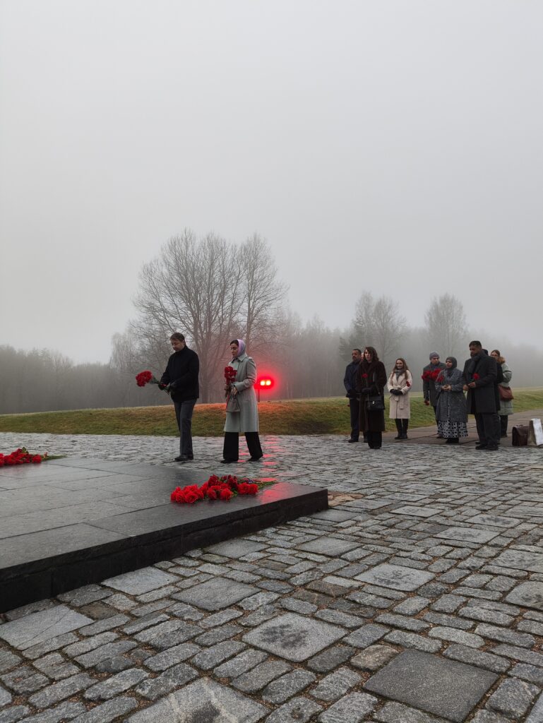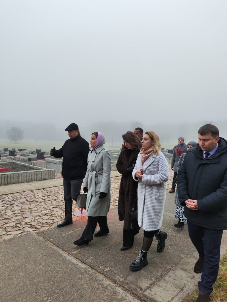 Гости почтили память мирных граждан, погибших в годы Великой Отечественной войны. Они возложили цветы к подножию Непокоренного человека и к Вечному огню. После для них Анна Жарская провела экскурсию по мемориалу и музею.
