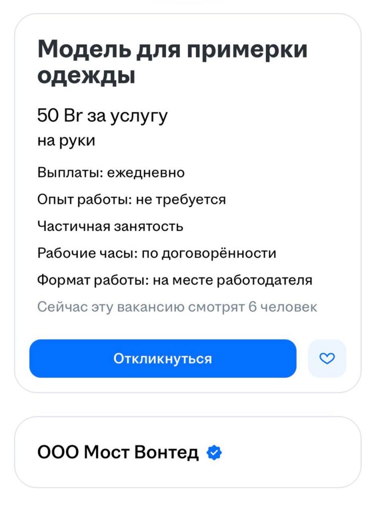 Работа, судя по описанию к вакансии, не пыльная. Все, что требуется от будущего сотрудника — примерять образцы одежды. За услугу предлагают 50 белорусских рублей, платить обещают ежедневно.