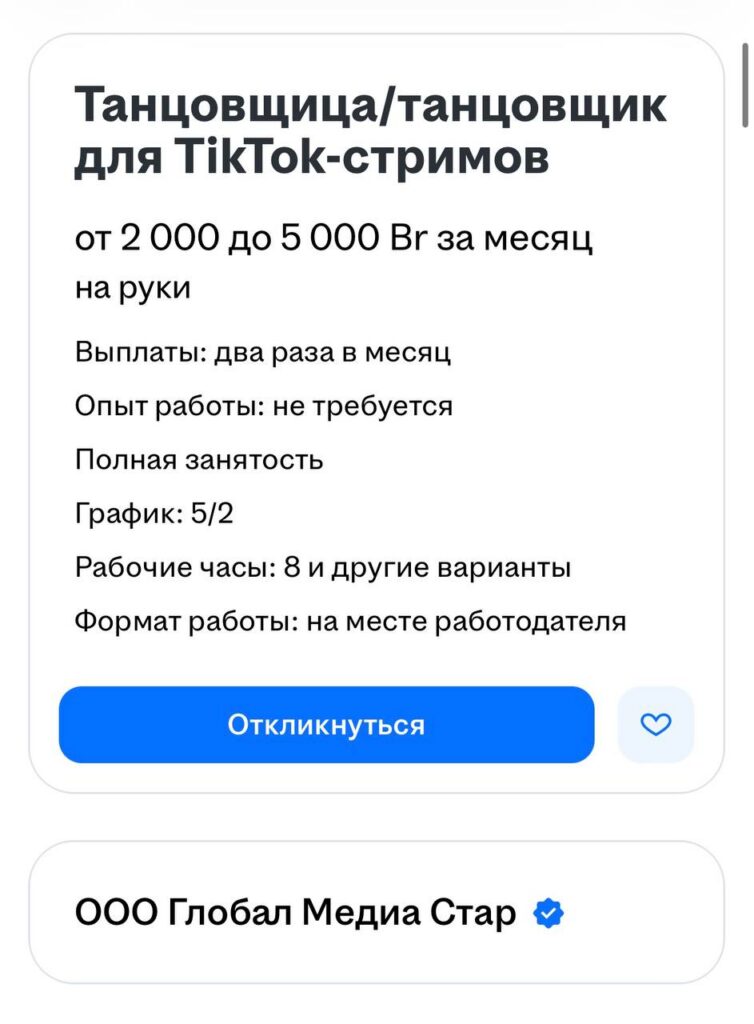 Все, что требуется от кандидата — участвовать в танцевальных батлах в TikTok-стримах. Зарплату предлагают впечатляющую: от 2 000 до 5 000 белорусских рублей на руки за месяц. Не места ли зумеров, желающих работать мало, а получать много?