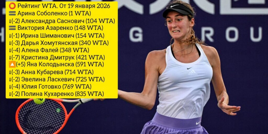 На 19-е января Арина Соболенко продолжает возглавлять мировой тотал. Несмотря на результат Australian Open она останется на первой строке. Александра Саснович на два шага отходит от заветной сотни. Она перемещается на 104-е место. Виктория Азаренко, про которую многие уже позабыли, сохраняет за собой скромную 148-ю строчку. Ирина Шиманович, установив недавно небольшой личный рекорд: 150-е место, отходит на 154-ю позицию. Дарья Хомутянская впервые за последнее время теряет три пункта. Она 340-я. Алена Фалей рядом — 348-я (-4). Кристина Дмитрук, заявилась на розыгрыш ITF W-50 Монастир, но семь соперниц впустила вперед — 421-я. Яна Колодынска, которая борется на турнире ITF W-75 Манама, пять пунктов добавила и поднялась на 591-ю строку. Анна Кубарева — 714-я (-3), Эвелина Ласкевич — 725-я (-2), Юлия Готовко — 769-я (-4), Полина Кухаренко — 835-я (-2).