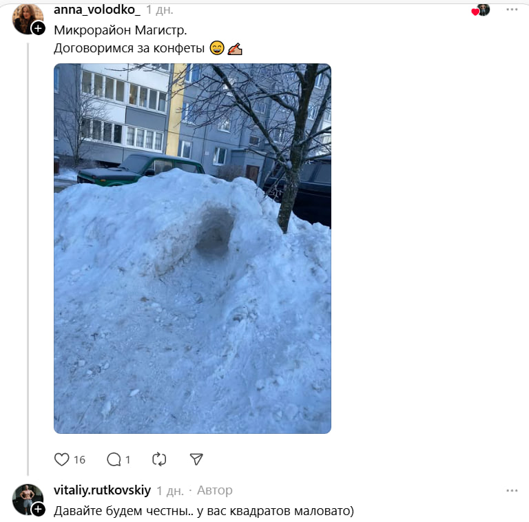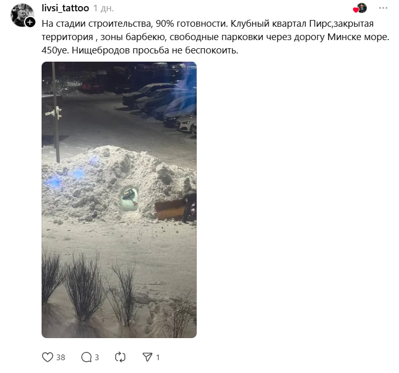 Пока минский рынок недвижимости ищет новое ценовое дно, находчивые «арендодатели» в соцсетях, кажется, уже откопали его в буквальном смысле — в сугробе. В Threads появилось объявление о сдаче «студии» в районе МК «Минск-Мир» всего за 200$, с залогом и коммуналкой в пару долларов.