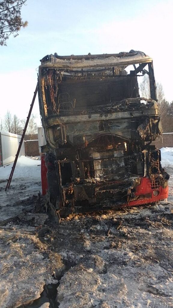 В результате пожара полностью уничтожены кабина и моторный отсек грузовика Renault Magnum.