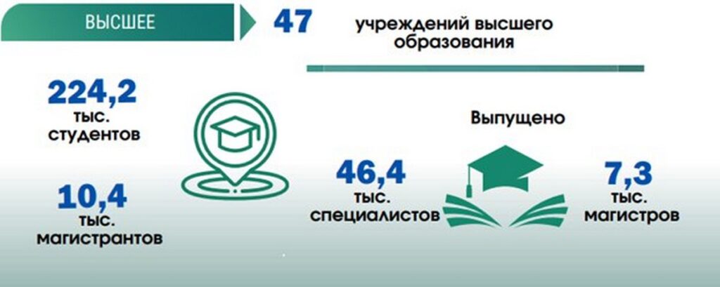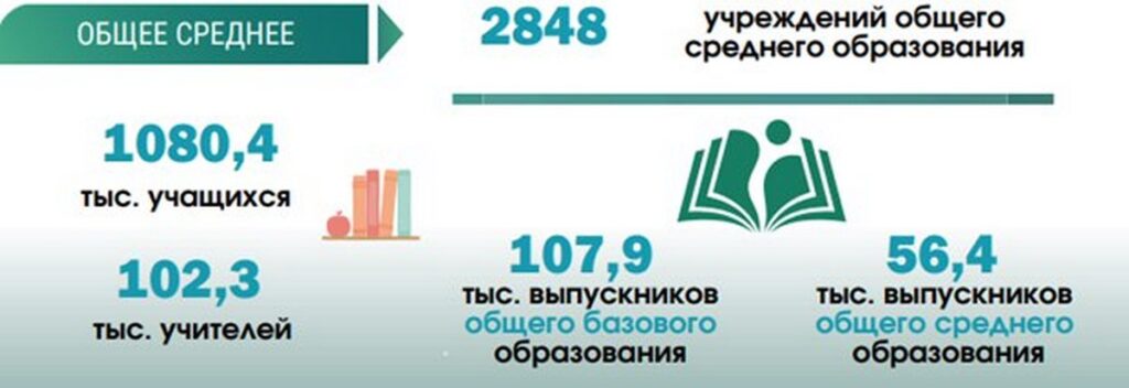 В системе общего среднего образования — 2848 школ, где учатся более 1 миллиона 80 тысяч учеников. Преподают им 102,3 тысячи учителей. В этом году школы выпустили 107,9 тысяч девятиклассников и 56,4 тысяч одиннадцатиклассников. С педагогическим составом школ тоже много проблем. Молодые специалисты не хотят идти работать учителями. Это связанно и с невысокими зарплатами, и с бюрократией внутри школы, и с «дедовщиной» опытного педагогического состава. С 1 января 2025 года зарплаты бюджетникам повысили, и хочется верить, что скоро молодых и талантливых учителей у нас будет больше.