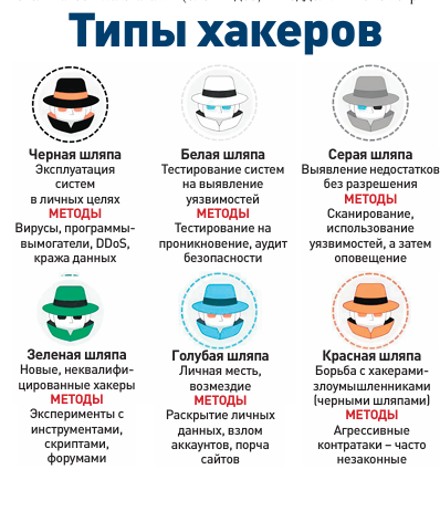 Хакеров делят на «черных», «белых» и «серых» в зависимости от целей и соблюдения закона. Эти термины берут свое начало в американских вестернах, где было принято разделять персонажей по цвету головного убора: у хорошего парня (шерифа) шляпа всегда была светлой, а у злодея — темной.