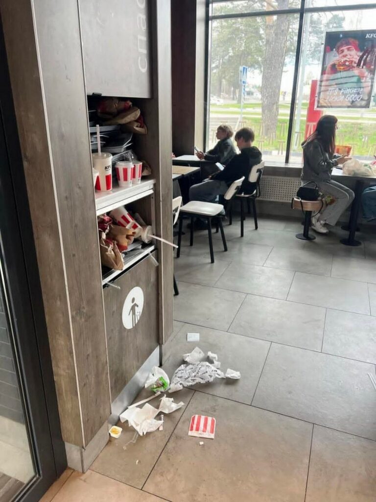 В соцсетях появились фотографии из кафе быстрого питания (KFC) в Борисове — снимки вызвали бурную реакцию. На столах — горы пустых стаканов, обёрток и неубранной посуды.
