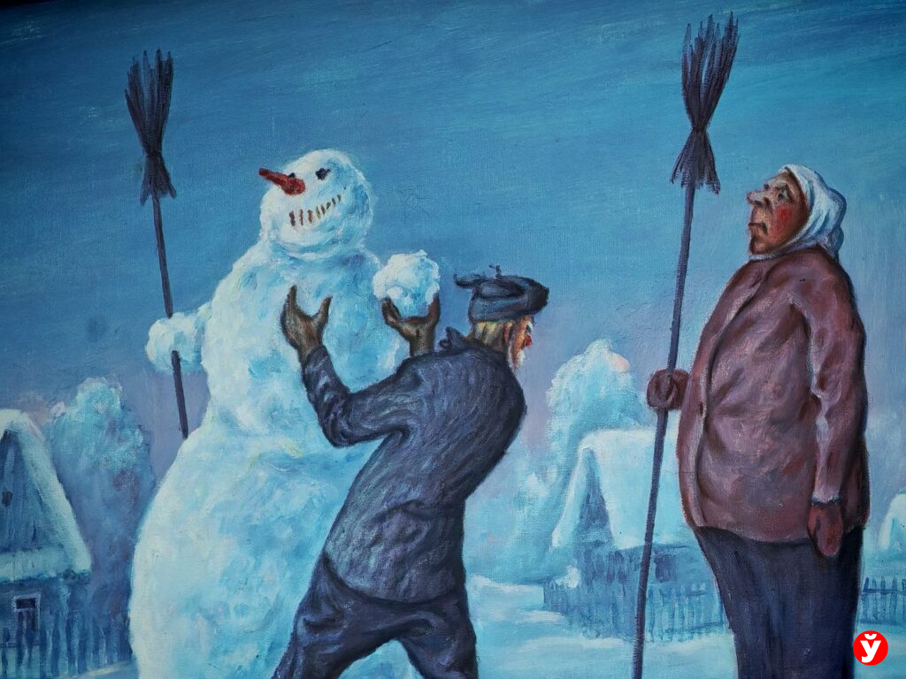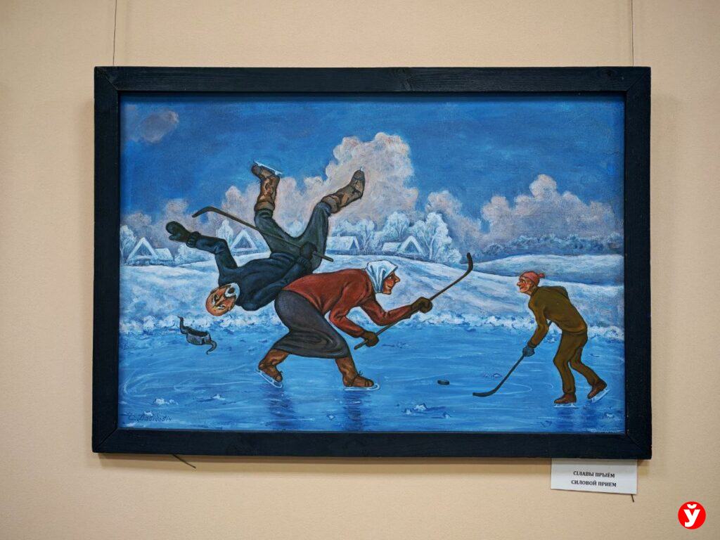Есть в галерее и спортивно-сатирический зал: на полотнах пожилые люди играют в теннис, хоккей, волейбол и преодолевают препятствия, — можно сказать, это ироничное воплощение их скрытых стремлений.
