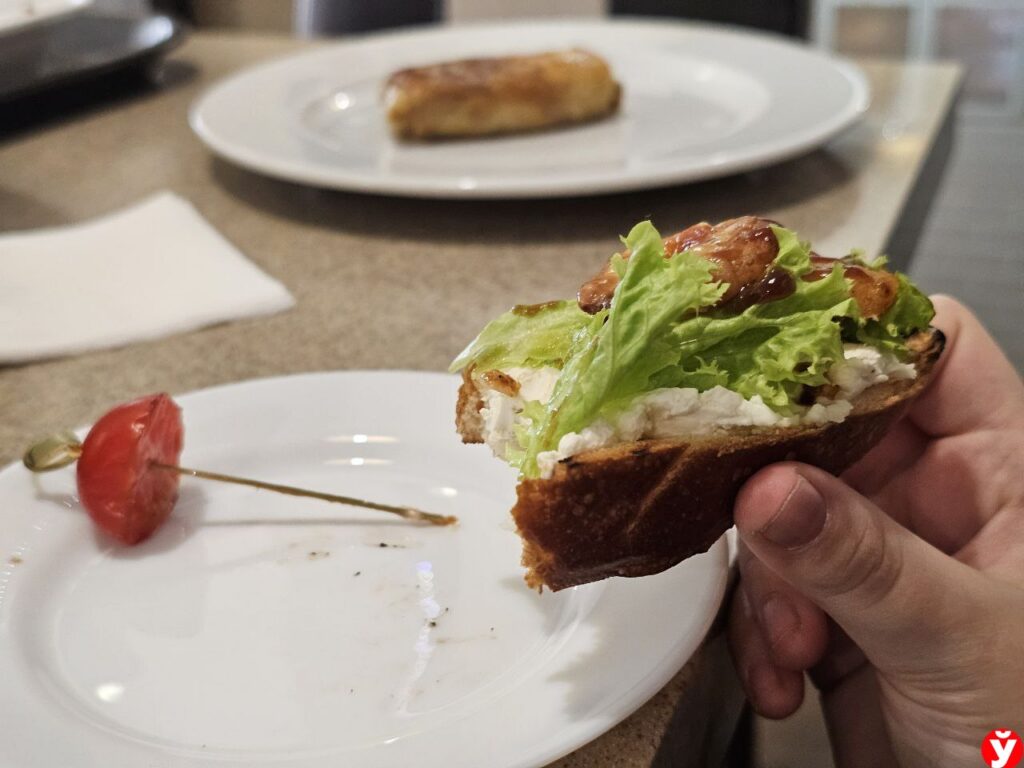 Дочка, помимо тарта, прихватила ещё блин с ветчиной и сыром (около 3 руб.) и брускетту с креветкой за 2,50 руб.