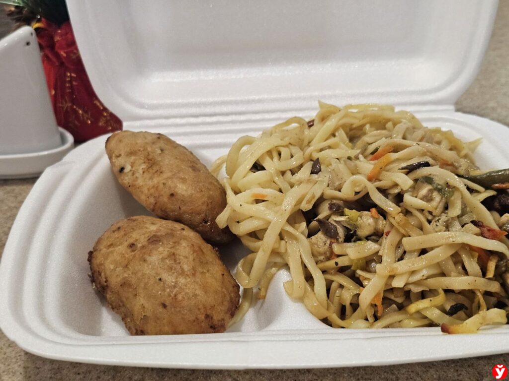 А ещё мы решили захватить обед для сына, который из школы ехал уже домой. Взяли ему лапшу удон с птицей (9,90 руб.) и две ароматные куриные котлеты (по 4 руб. за штуку). Удобно, что здесь же предлагают контейнеры — упаковали всё за минуту.