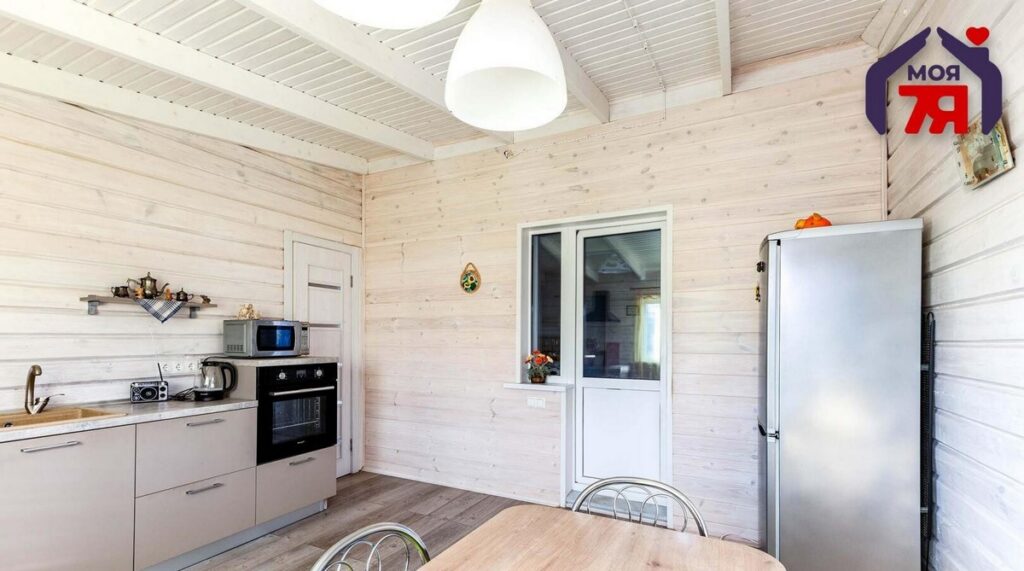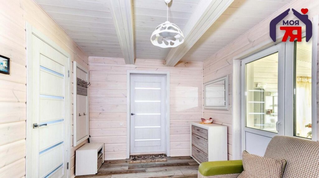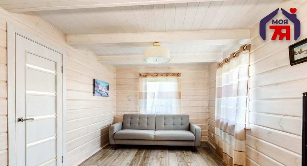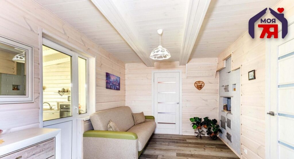 Внутреннее оформление дачи выполнено в светлых тонах. Стены и потолки обшиты натуральным деревом, а полы выполнены из ламината и плитки.