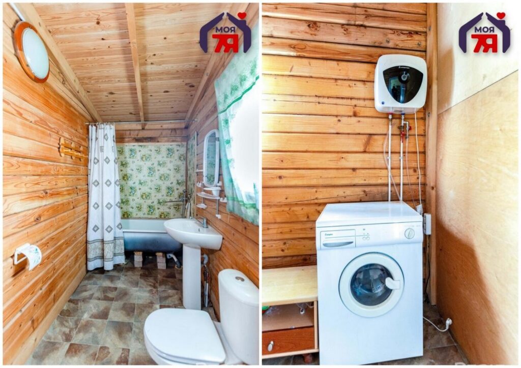 Отопление в доме осуществляется с помощью печки. Туалет и ванная комната находятся внутри здания. Канализация местная, а вода подогревается бойлером. В ванной комнате уже установлена стиральная машина.