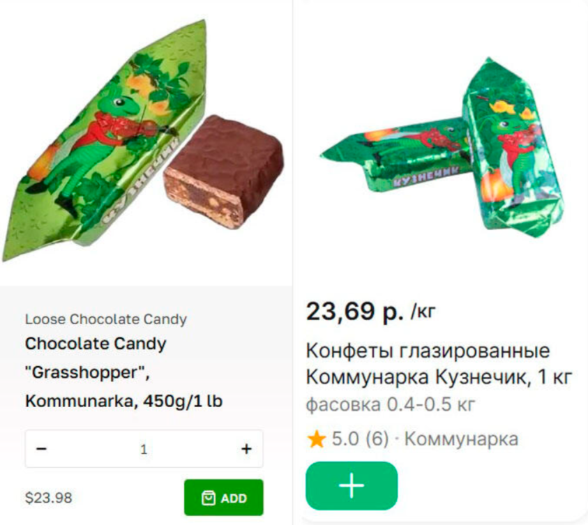Наиболее высокой ценой в обзоре отличаются конфеты «Кузнечик». В США за 450 грамм просят почти $24, а килограмм стоит около $53, или чуть более 150 BYN.