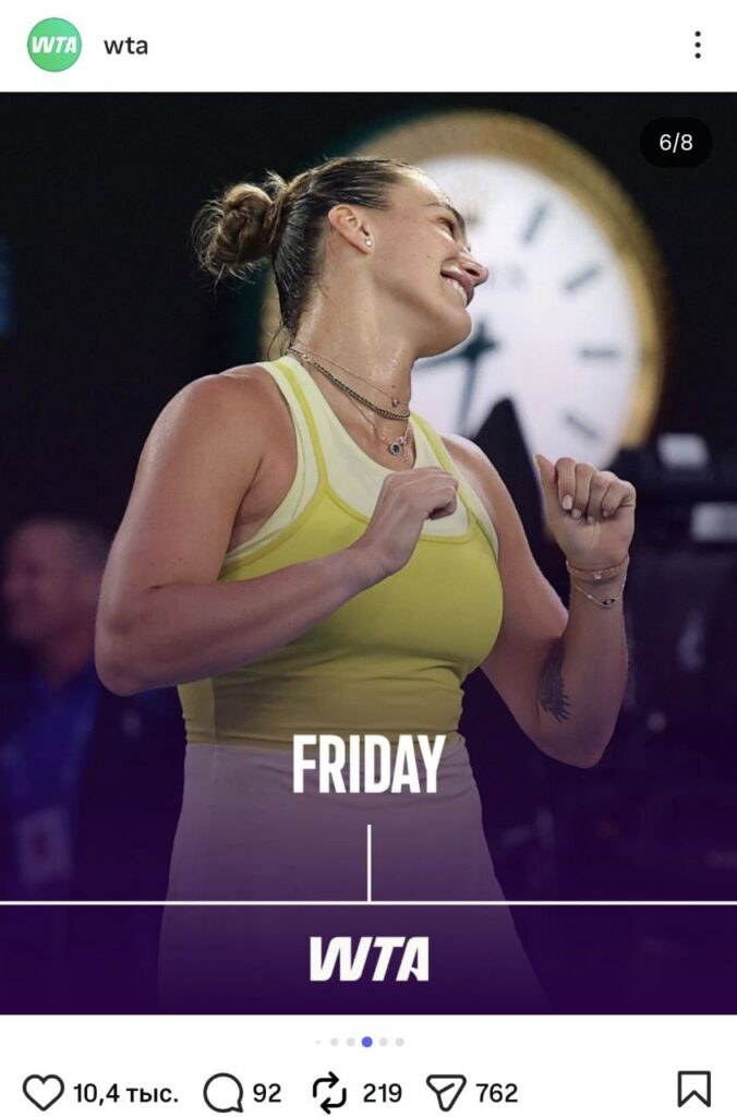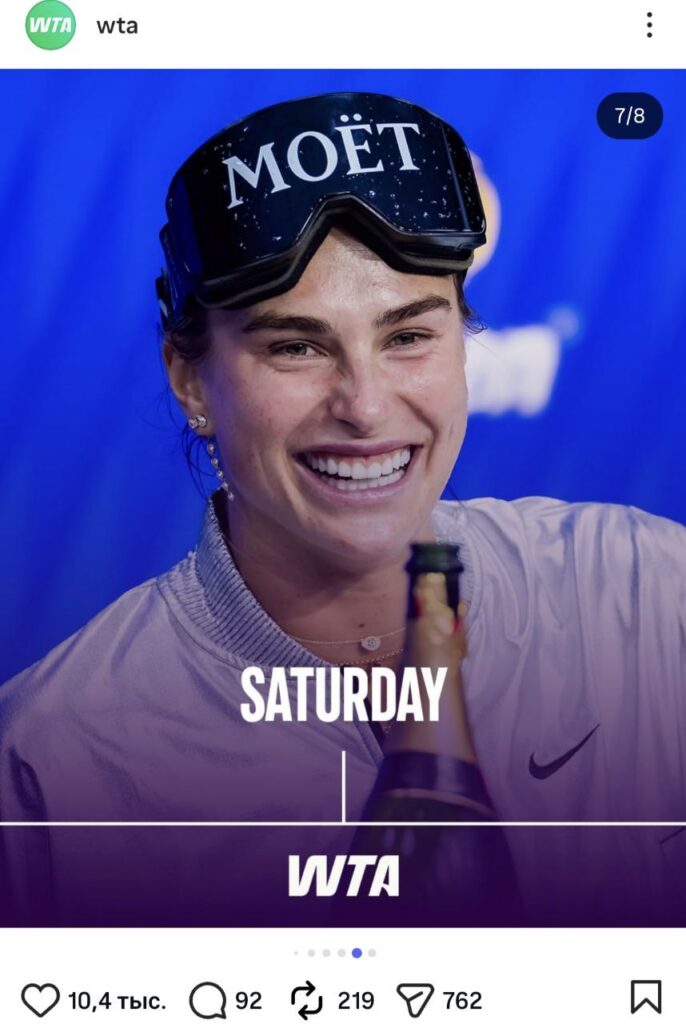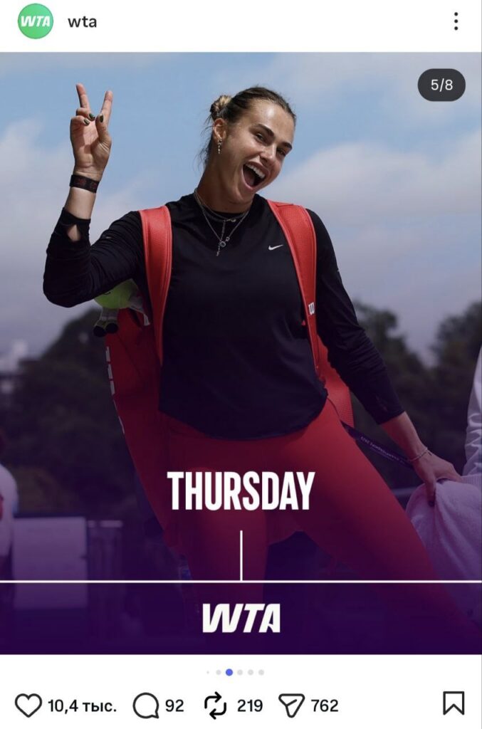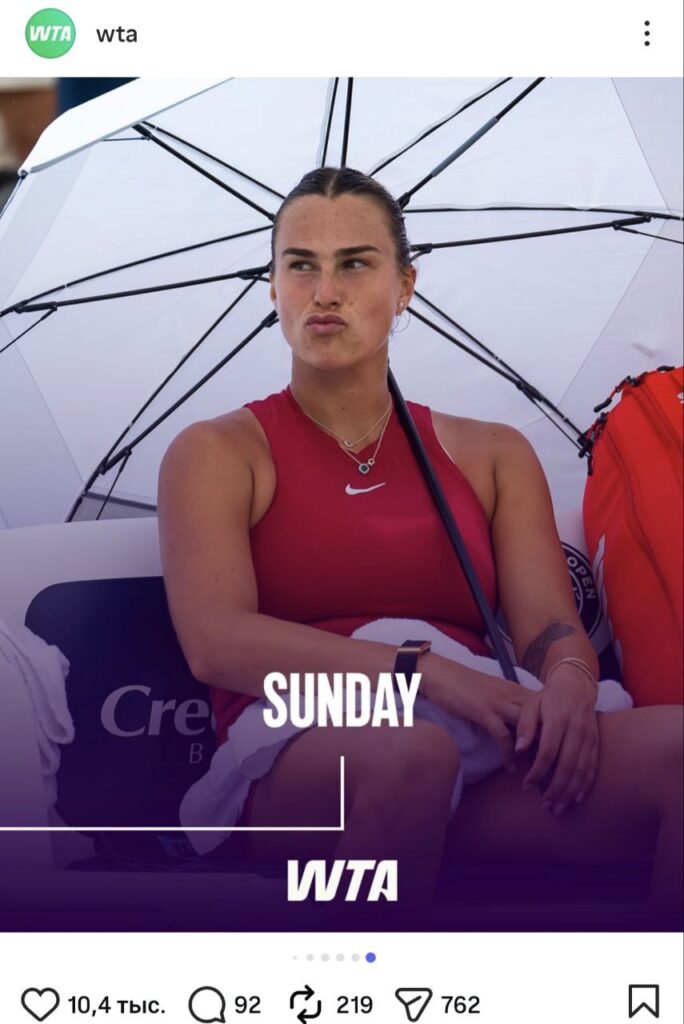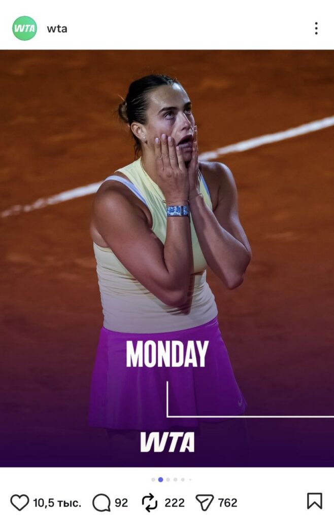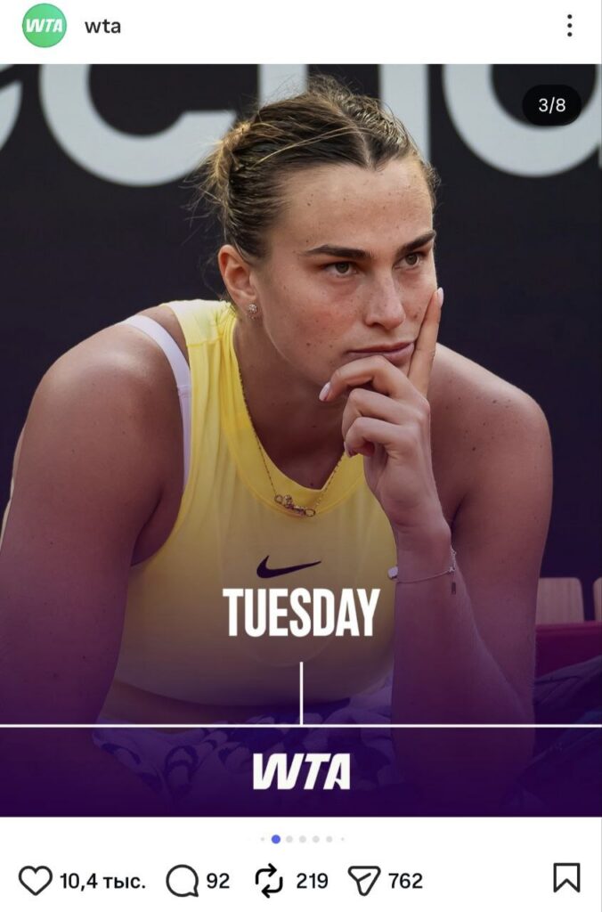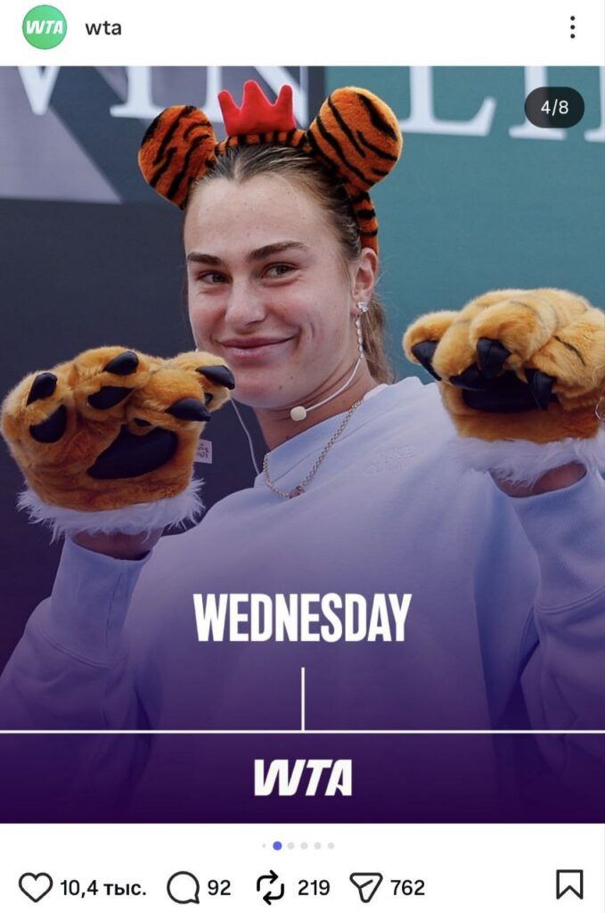 Ваша неделя в роли Арины Соболенко, именно так называется новая идея ассоциации. На понедельник была подготовлена фотография Тигрицы, где та хватается за лицо и тянет щеки. Дело было на грунте, а что за матч, к сожалению, вспомнить будет трудно. В любом случае, фотографии олицетворяет трудности начала недели и сложности отхода после бурных выходных. На вторник WTA выбрала задумчивую Арину. И действительно, второй день недели заставляет обывателей задуматься о смысле жизни, и, возможно, планах на субботу и воскресенье.
