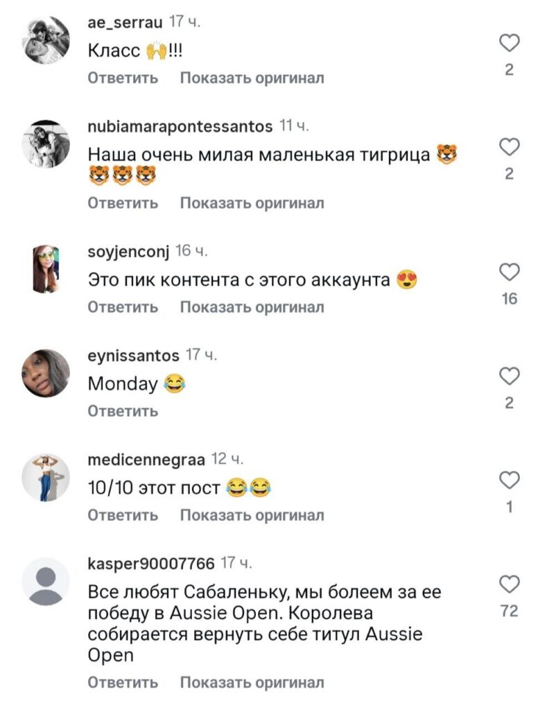 Уверен, вы тоже знаете, что на планете Земля многие любят и болеют за белоруску. Десятки положительных комментариев появились и под этим постом. «Хочу такой календарь», «Саба — королева», «Наша очень милая маленькая тигрица», «10/10 этот пост», «Все любят Соболенко. Мы болеем за ее победу в Австралии. Королева собирается вернуть себе титул в Австралии». «Этот костюм тигра просто супер». Запись собрала более 10,5 тысяч лайков.