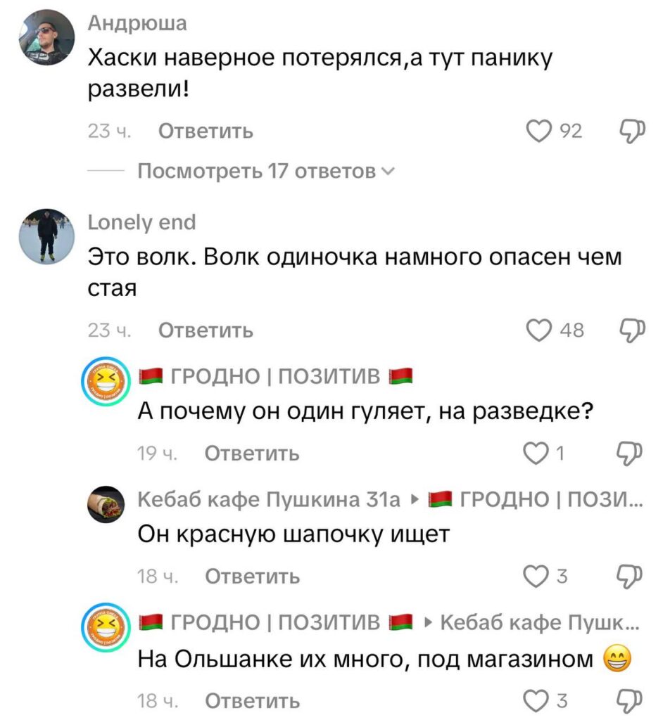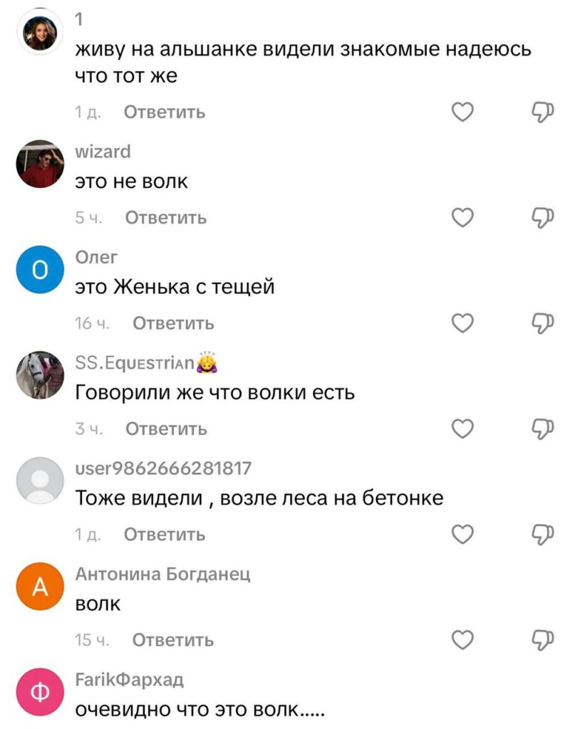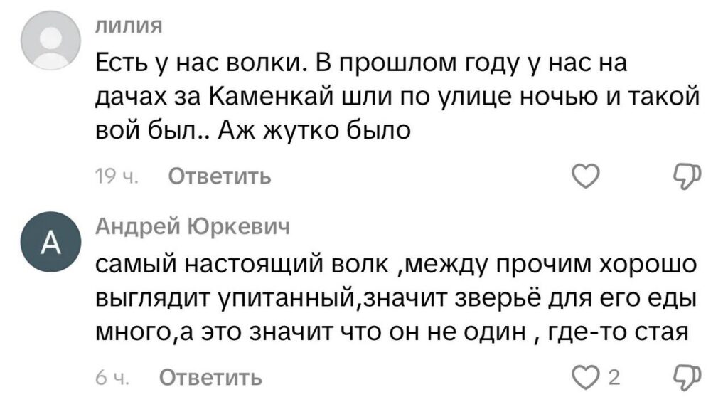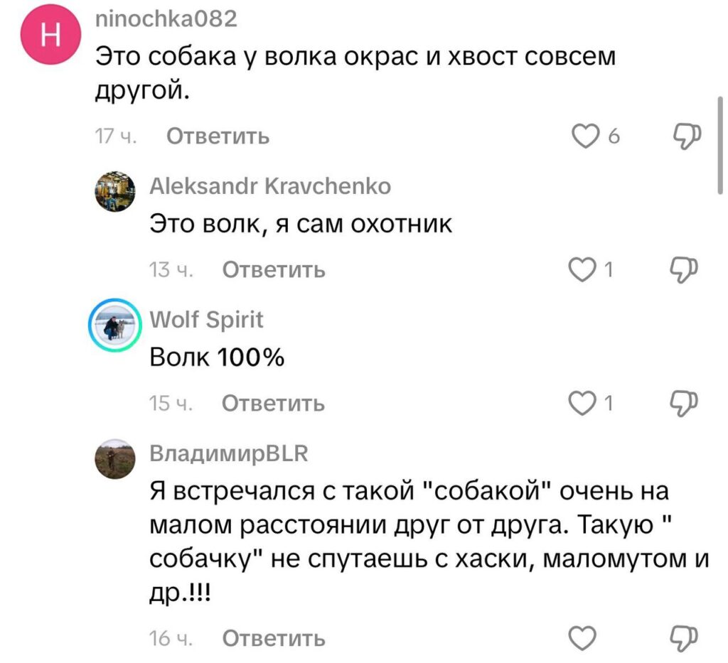 Комментарии сразу разделились: одни уверены, что это волк, другие — что обычная домашняя собака, например, хаски или шпиц. «У самого такая порода, и не раз, когда он сбегал, путали с волком», — пишет один из пользователей. Другие добавляют, что отличить волка от хаски с расстояния сложно, особенно если хвост не поднят.
