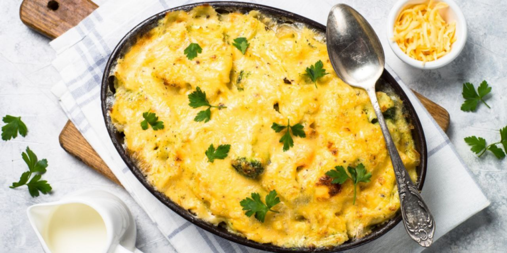 - Отправьте форму в разогретую до 180 градусов духовку. Выпекайте около 25 минут до образования румяной сырной корочки.