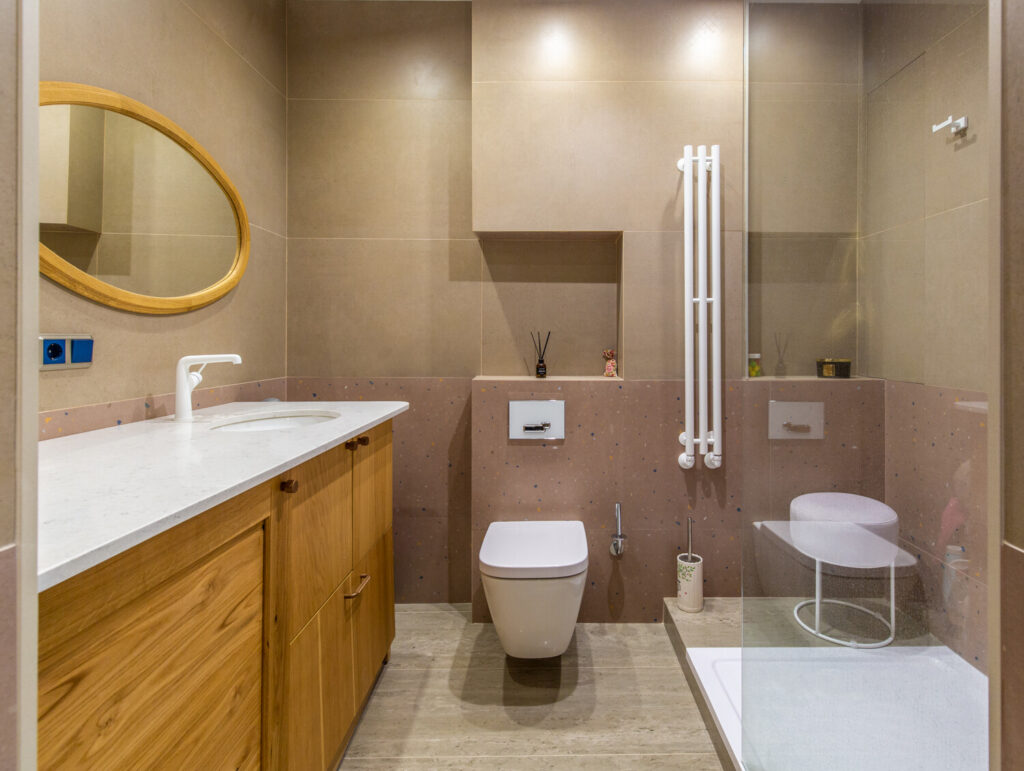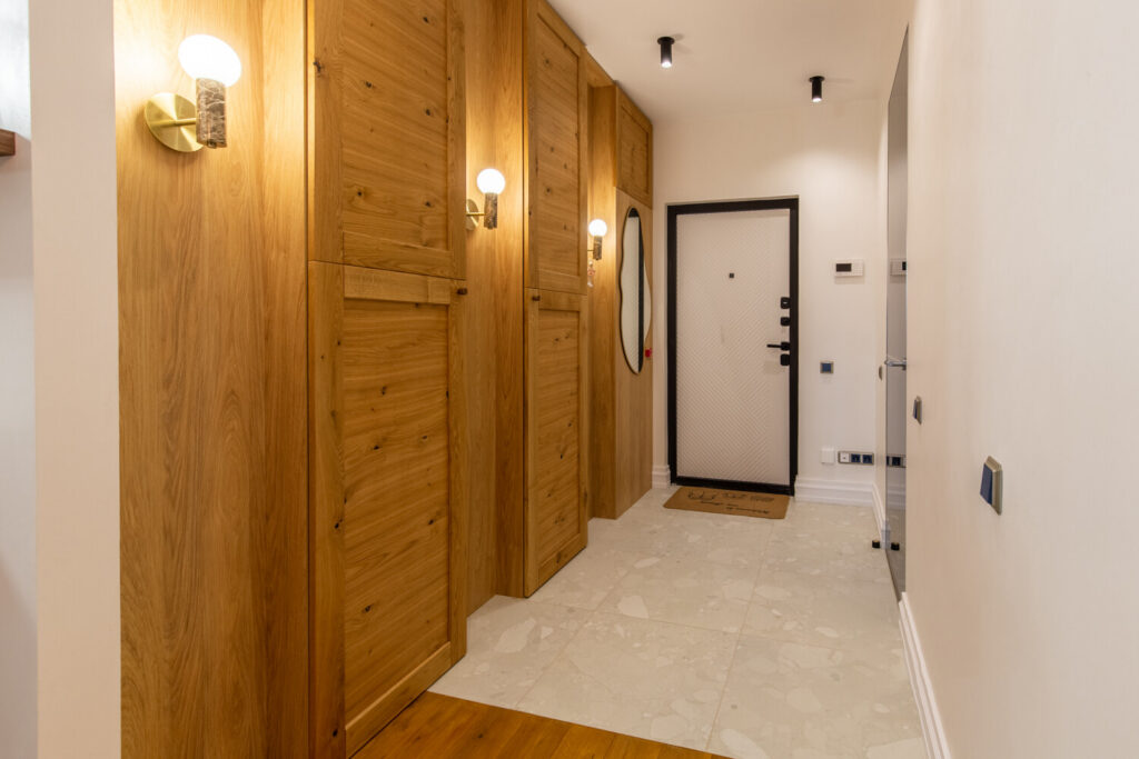В коридоре квартиры предусмотрены встроенные шкафы, что позволяет эффективно использовать пространство для хранения вещей и поддерживать порядок. Совмещенный санузел оборудован душевой кабиной и инсталляцией, что делает его удобным и практичным.