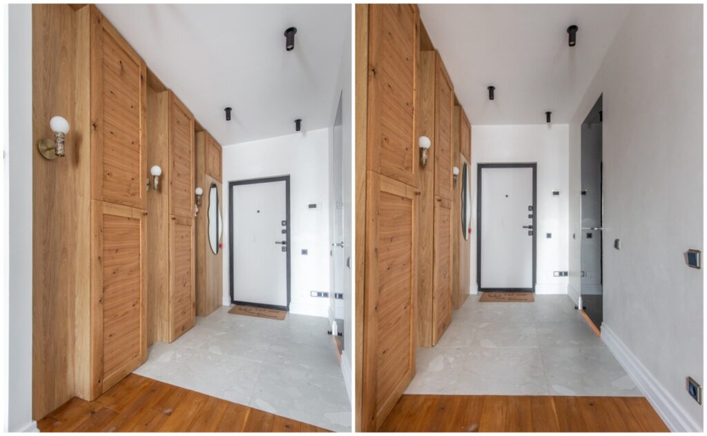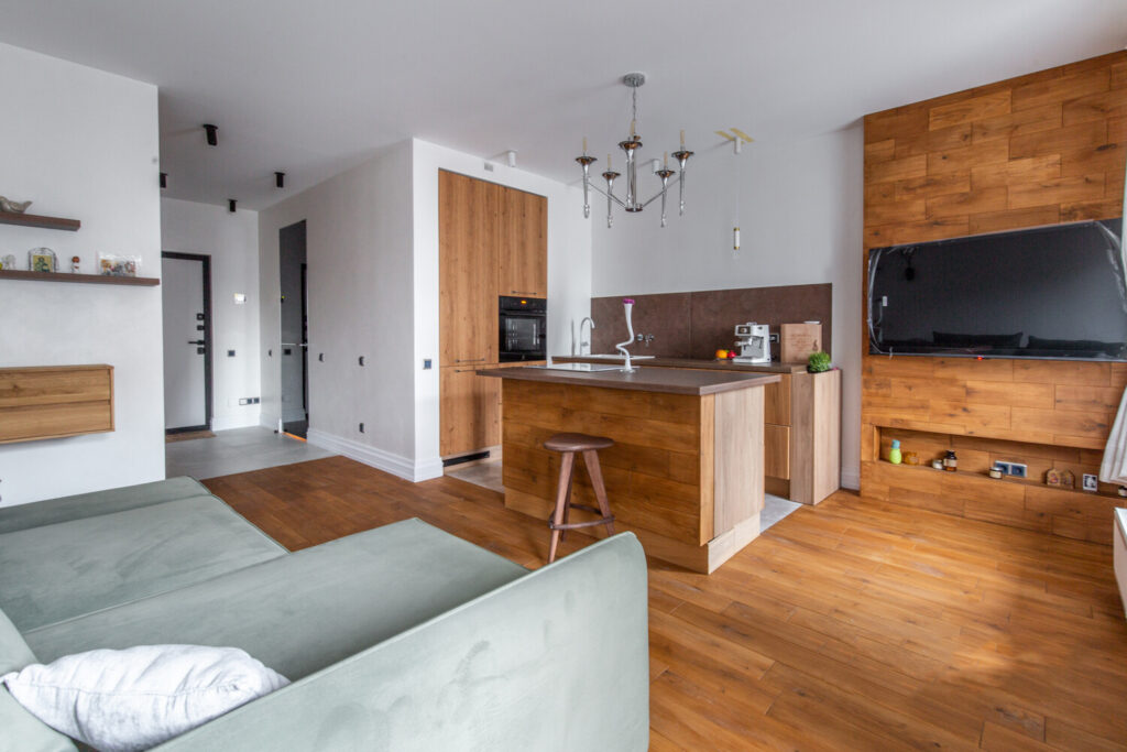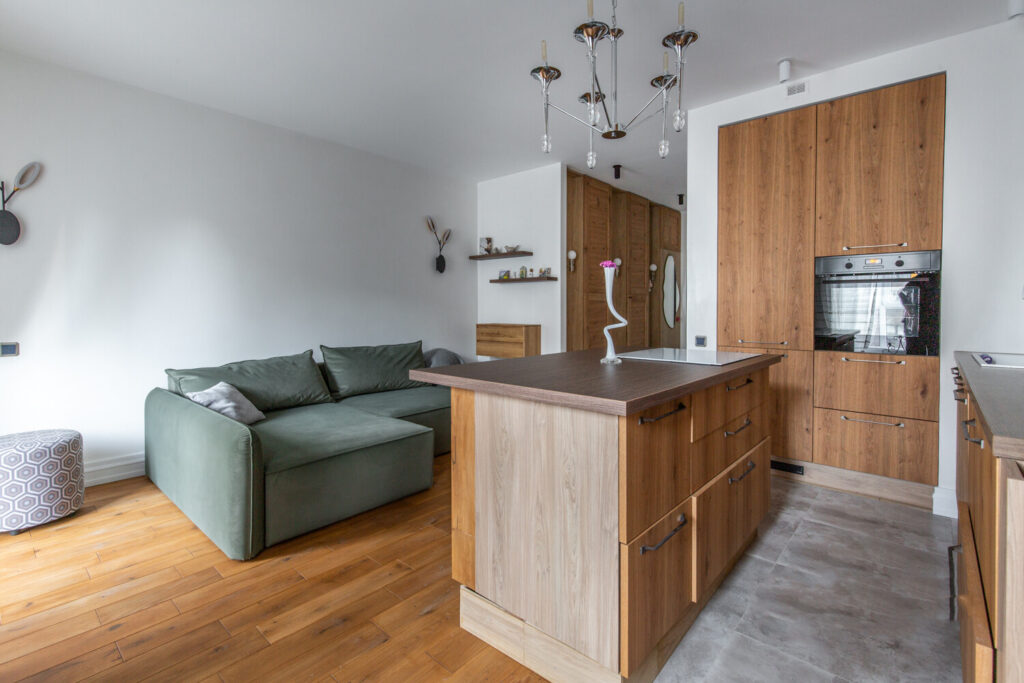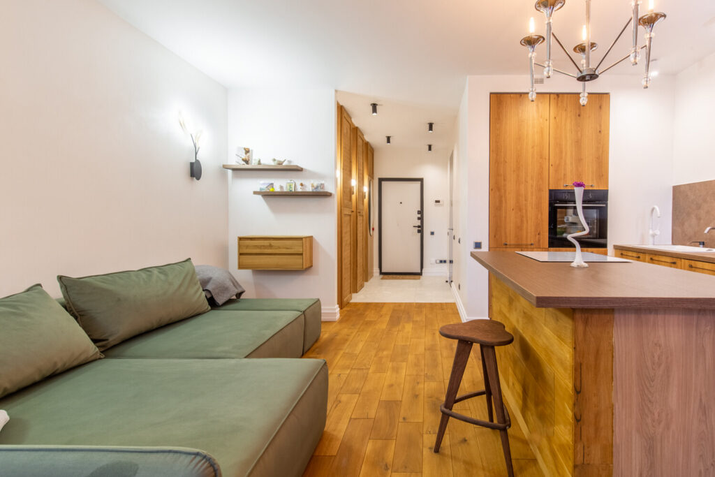Студия располагается на пятом этаже, и ее планировка продумана до мелочей. Интерьер студии выполнен в свежем и современном стиле, благодаря обилию деревянных материалов, которые добавляют тепла и уюта в атмосферу жилья. Основной цвет стен — белый, который гармонично сочетается с теплым оттенком деревянной мебели и пола, создавая ощущение простора и света.
