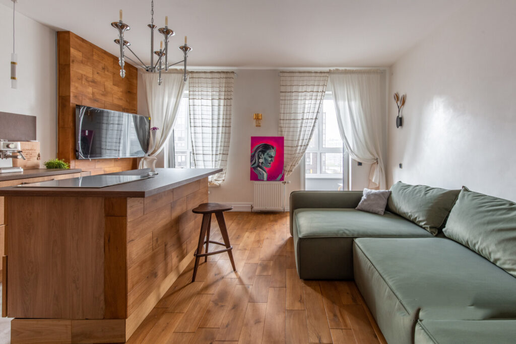 На противоположной стороне от кухни находится просторный диван, а также зона для просмотра телевизора. Одним из главных преимуществ данной квартиры является наличие двух окон, что обеспечивает отличное естественное освещение и делает пространство более живым и воздушным.
