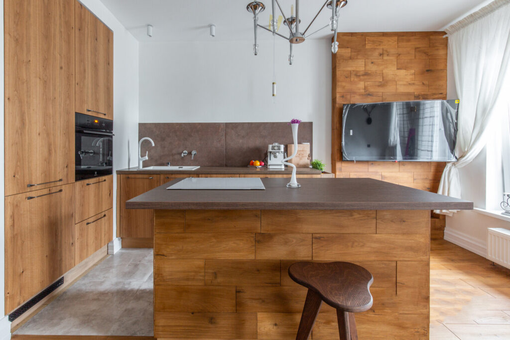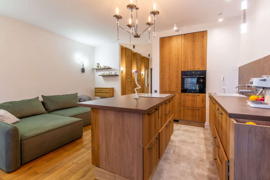 Большая часть пространства отведена под кухонную зону, где установлена встроенная техника, включая холодильник и духовку. Варочная панель расположена на острове, который не только выполняет функцию рабочего пространства, но и заменяет обеденный стол, что позволяет экономить место и добавляет функциональности. Остров также предоставляет дополнительные места для хранения, что особенно важно для компактной квартиры.