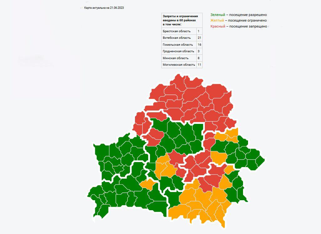 Карта показывает, что в 5 регионах Минской области введены запреты, в 3 действуют ограничения и в 14 разрешено посещение лесов. В Мядельском, Молодечненском, Воложинском, Пуховичском, Стародорожском районах в настоящее время действуют запреты. В Слуцком, Копыльском, Узденском районах в настоящее время действуют ограничения. В Вилейском, Логойском, Минском, Смолевичском, Червенском, Борисовском, Крупском, Березинском, Дзержинском, Столбцовском, Несвижском, Клецком, Солигорском и Любанском посещения разрешены.