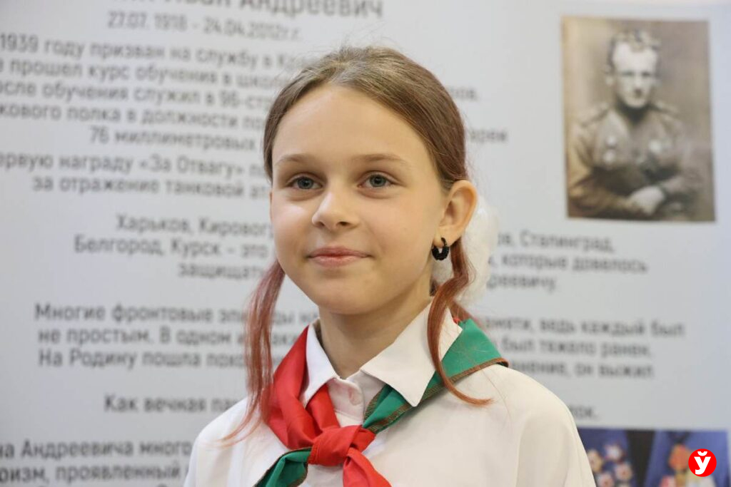 — А горжусь я своим дедушкой Иваном Потапчиком и бабушкой Натальей, — рассказала маленькая Аня Довгель. — Дедушка ушёл на фронт, когда ему не было и 18 лет. Первую медаль «За отвагу» получил в 1942 году. Дедушка защищал и освобождал Харьков, Днепропетровск, Сталинград, Курск, Белгород. Он несколько раз был ранен — на его руке на всю жизнь остался осколок. На войне дедушка встретил бабушку Наталью: она была призвана в ряды Красной армии 3 июля 1943 года. Ещё до окончания войны дедушка с бабушкой поженились, а в мирное время они уехали в уютный городок Смолевичи, где у них родилось трое детей.