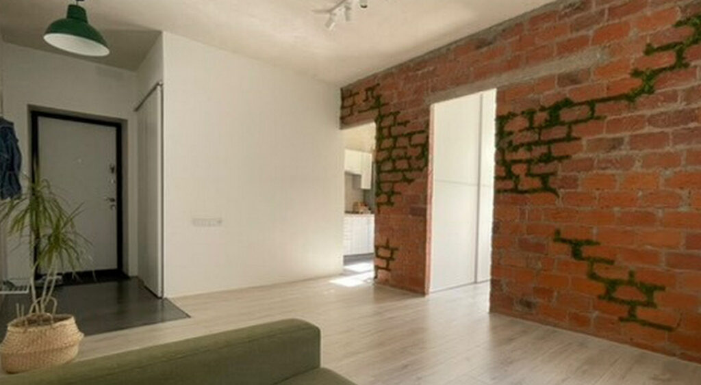Нашли минималистичную съемную двушку недалеко от Парка Челюскинцев. Квартира хоть и не обладает изобилием мебели, но удивляет необычным решением — кирпичной стеной без отделки внутри.