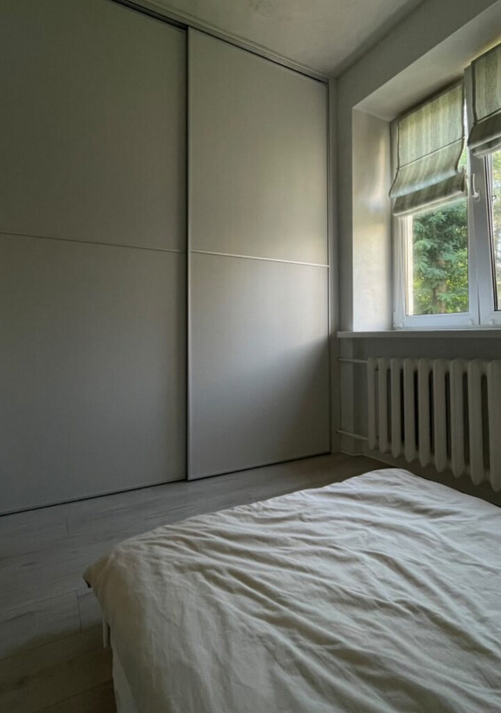 Квартира разделена на две комнаты кирпичной стеной — спальню и общую жилую зону. В спальне имеется кровать на двоих и шкаф, в жилой зоне — диван.