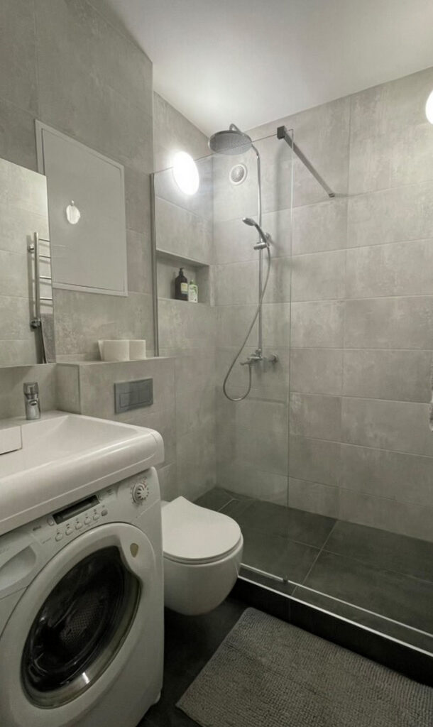 Кухня укомплектована необходимым набором техники — холодильник, плита. Санузел совмещенный, с душевой кабиной. Кроме того, имеется стиральная машина.