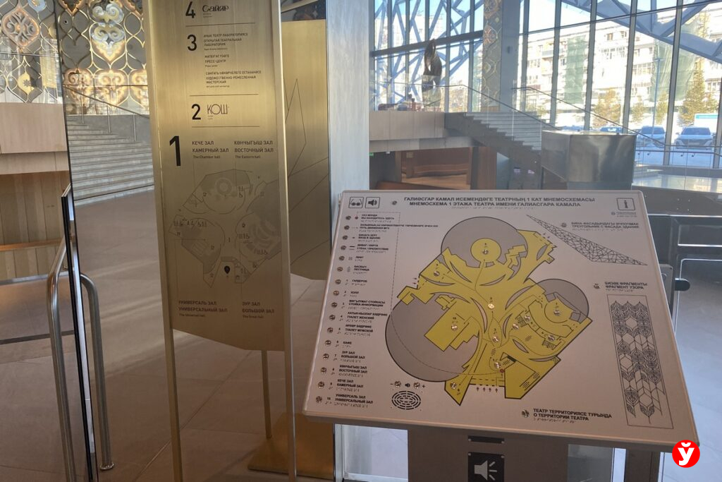 Есть в Казанском национальном театре еще один зал, где зрители могут смотреть на сцену с разных ракурсов, а декорации тут хранятся прямо под полом. Для глухонемых установлена специальная ложа с сурдопереводчиком. И поскольку все спектакли проходят исключительно на татарском языке, в театре предусмотрен синхронный перевод, который можно услышать, подключившись к приложению в мобильном телефоне.