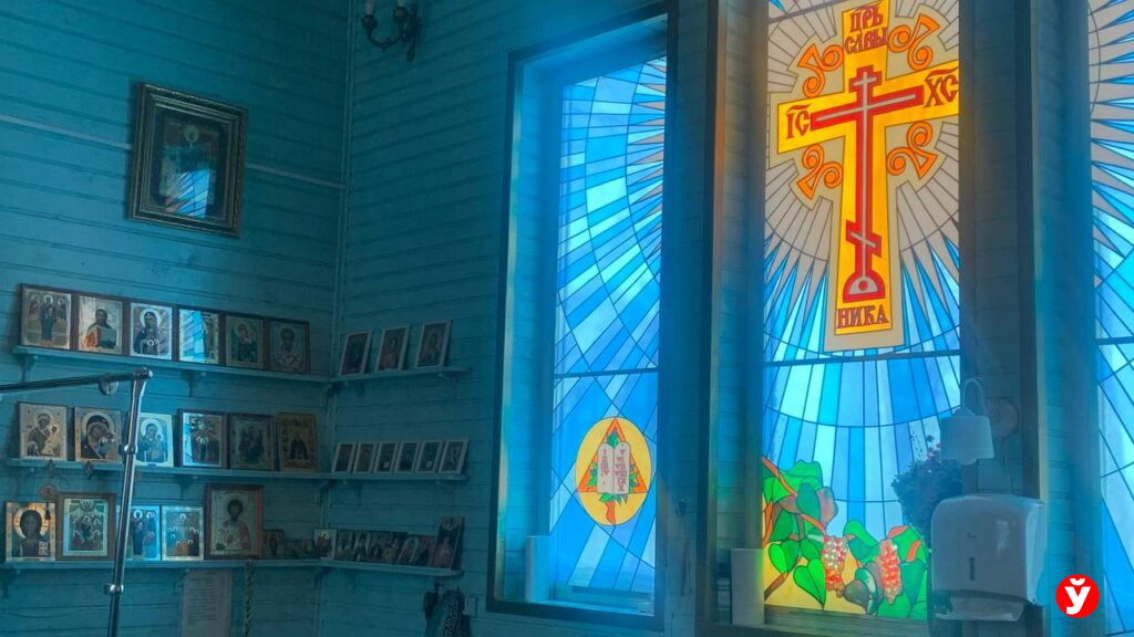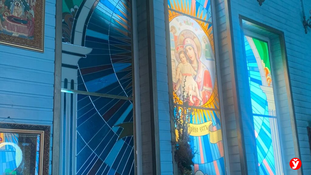 Люди приходят в храм и очень многие помогают, вносят лепту в его возрождение. На стенах, к примеру, имитация бруса. Каждая досточка, объясняет батюшка, кем-то пожертвована. И витражи также были заказаны и подарены храму дарительницей.