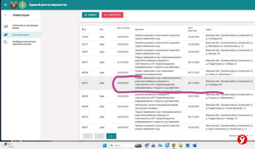 В Блужском сельсовете Пуховичского района, судя по информации Единого реестра, на данный момент в работе 27 домов. Статусы у всех разные: по некоторым принято окончательное решение о сносе; другие пока лишь выявлены как пустующие; у третьих нашелся законный владелец. Светло-серый домик в Слободке, который привлек наше внимание — уже признан пустующим. Но его последний статус — «подано заявление в суд о признании жилого дома бесхозяйным и передаче в собственность административно-территориальной единица», то есть сельисполкому. Если такое решение будет принято — объект выставят на продажу.